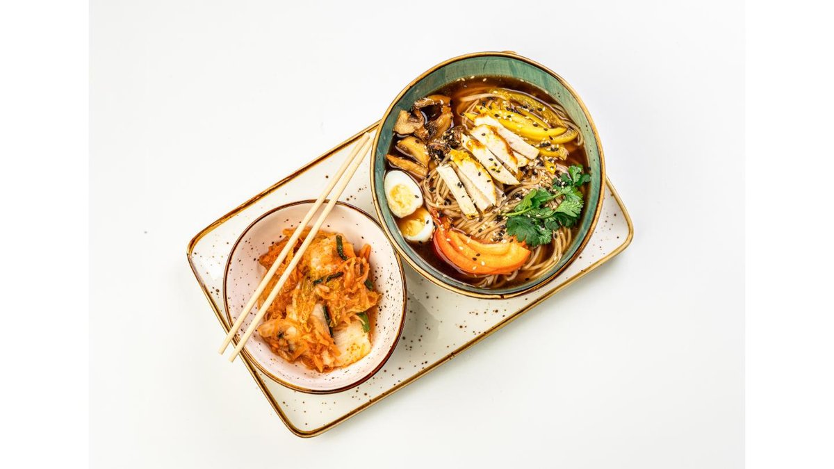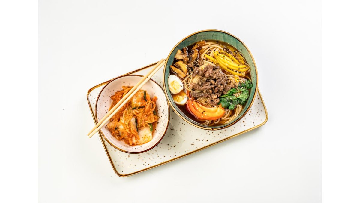 Ramen noodles, chicken broth, bell pepper, soy sauce, mushrooms Beef, cilantro, cherry tomatoes, quail eggs, sesame seeds, kimchi