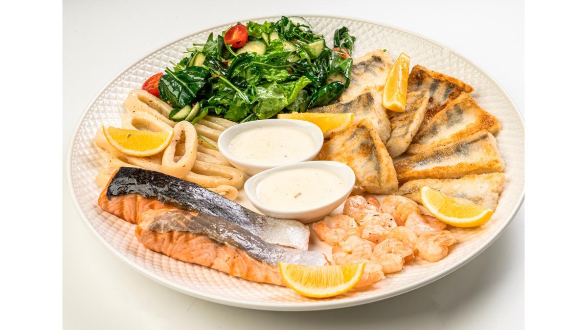Salmon, pike perch, shrimp, squid, light salad, sauces, lemon