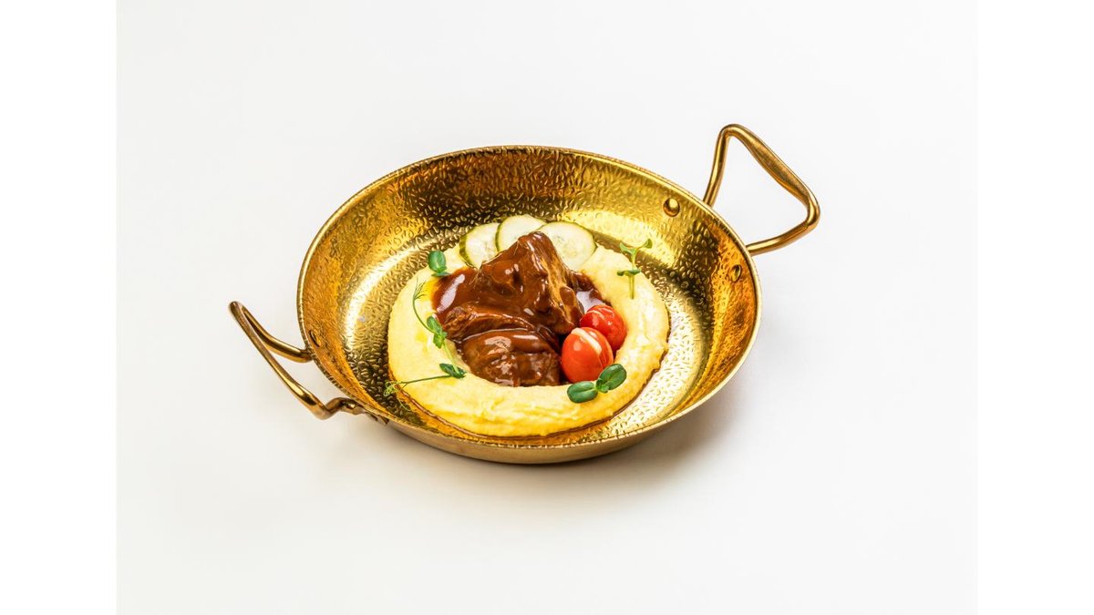 Mashed Potatoes, Braised Veal Cheek, Sauce Demi-glace, pickles