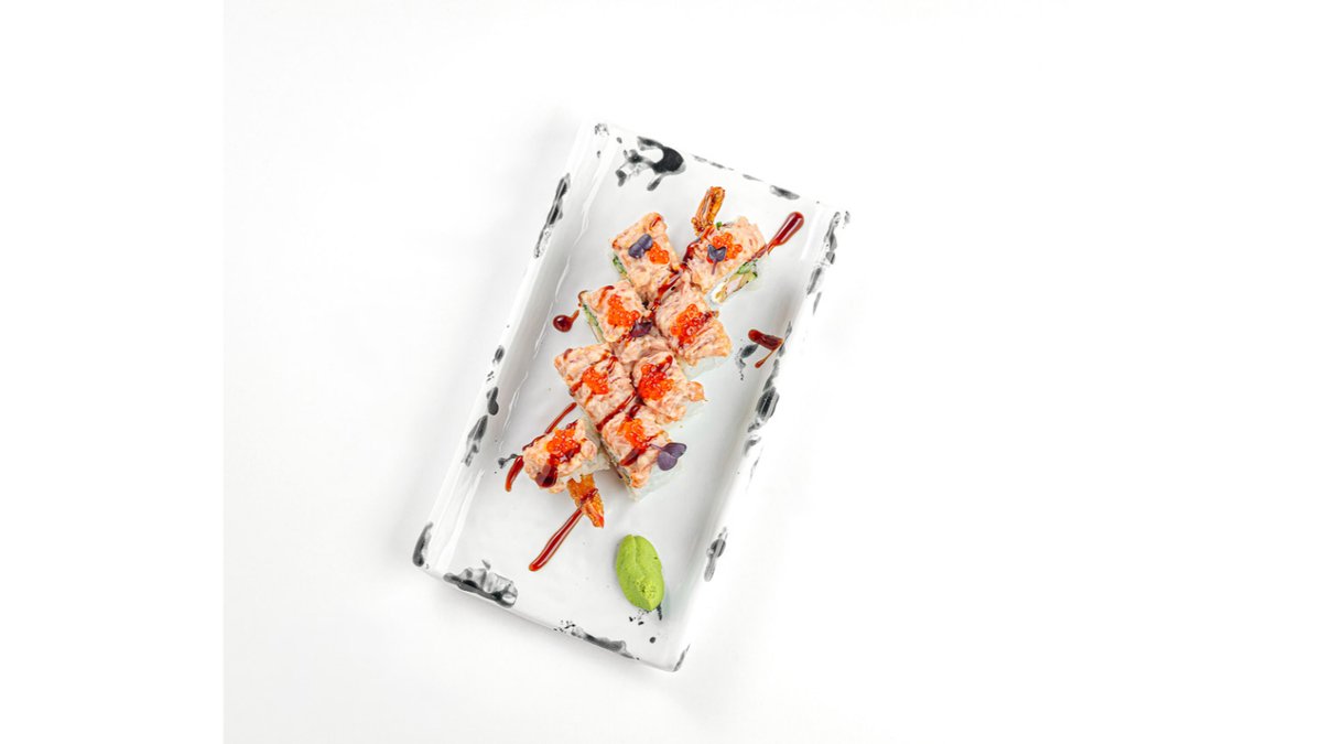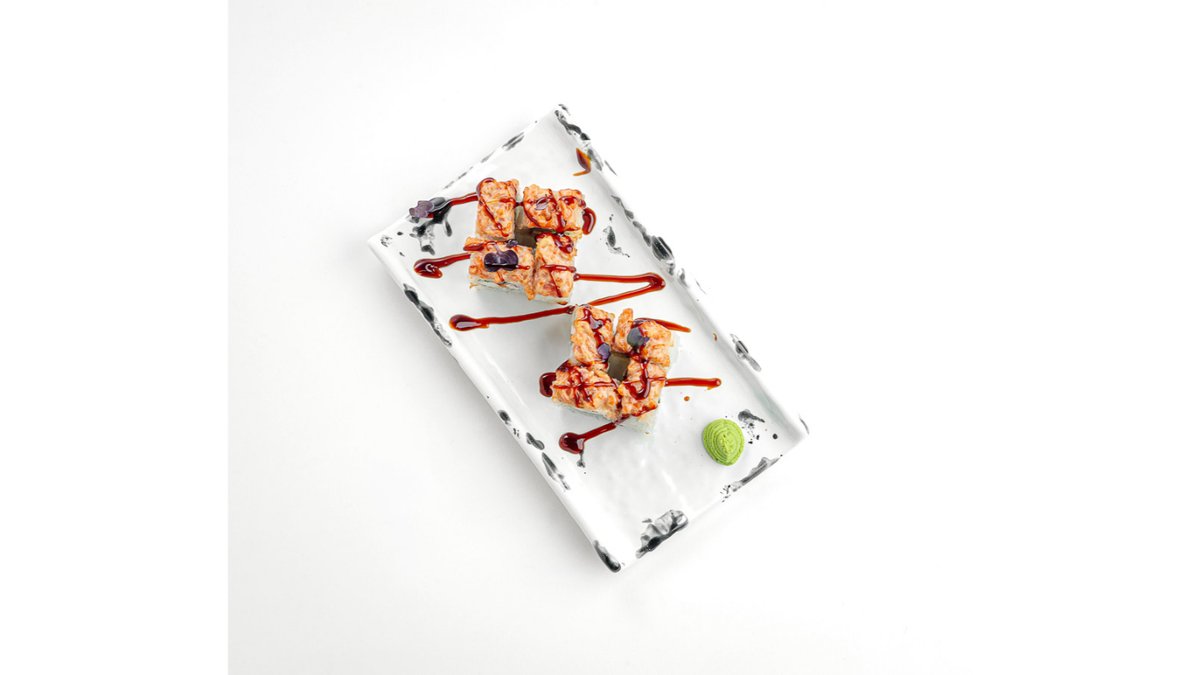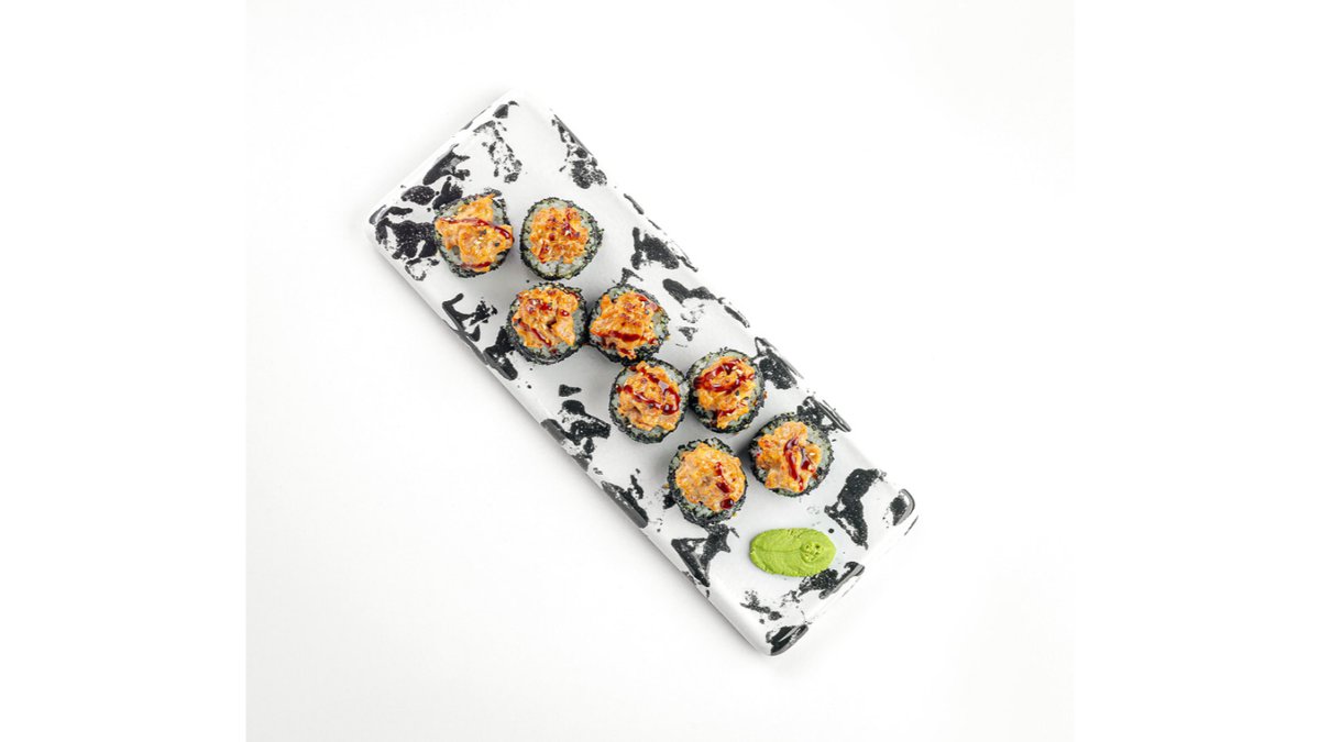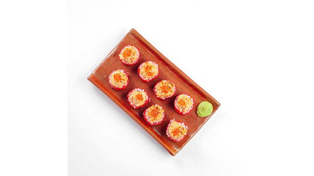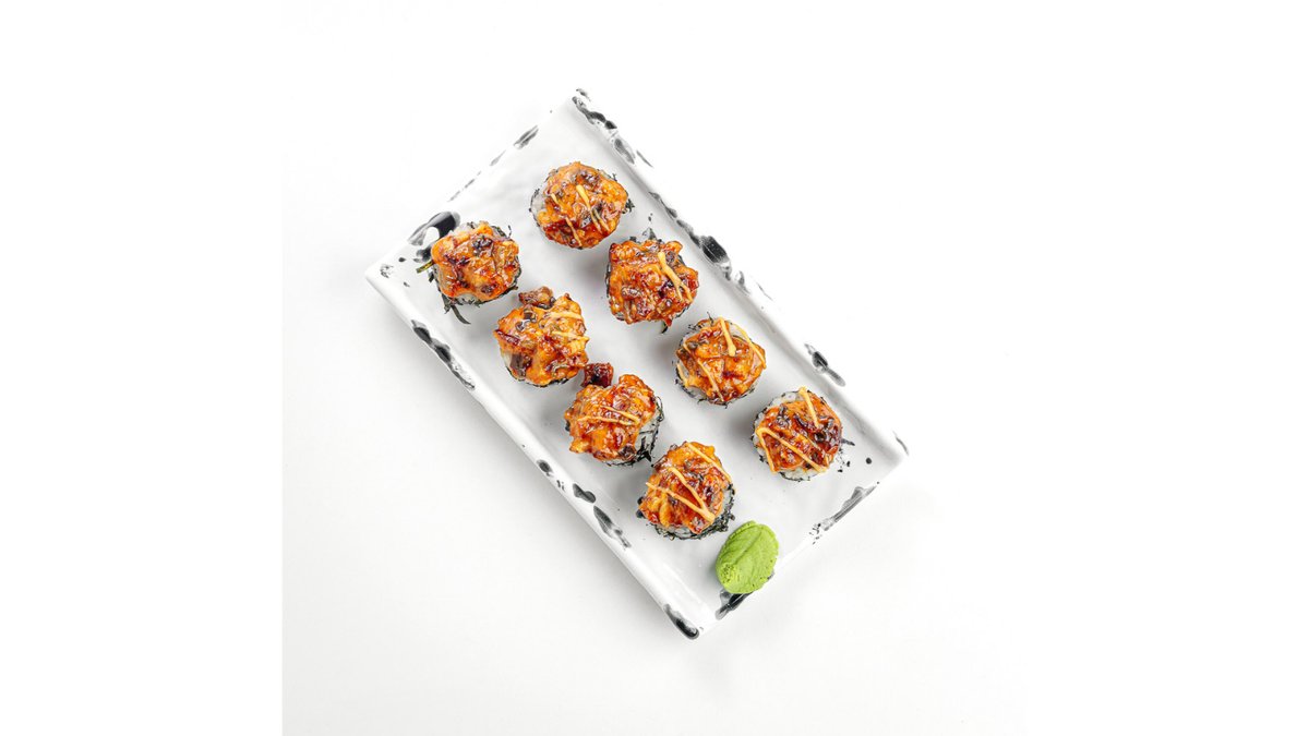 Бостон, калифорния с лососем, сяке темпура, запеченный с крабом, 2 нигири лосось, 2 нигири с креветкой