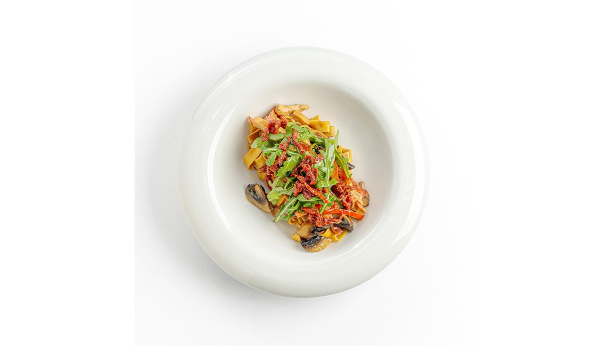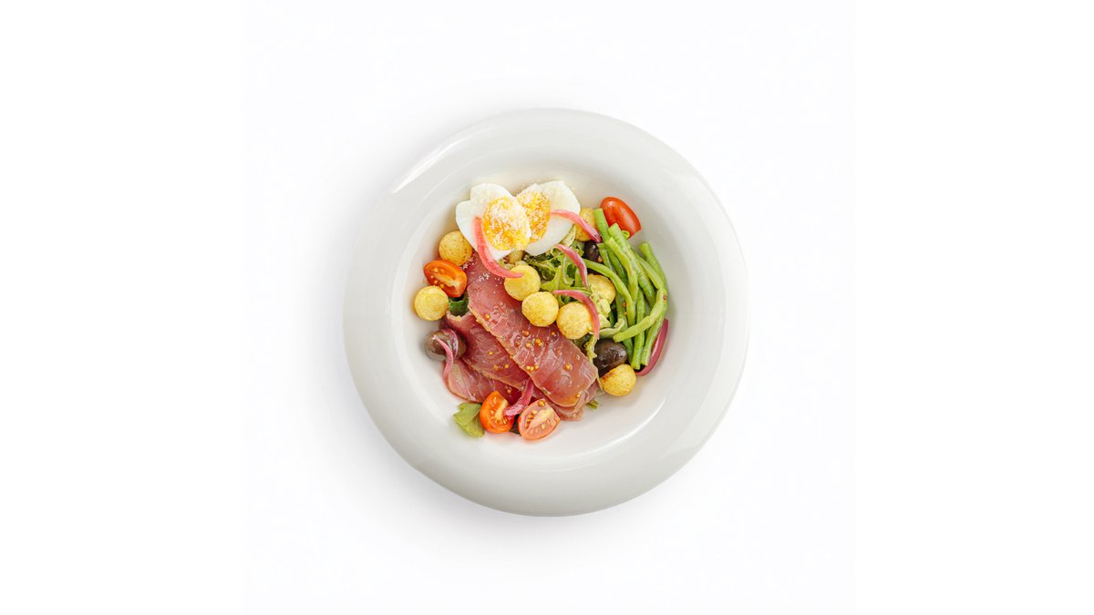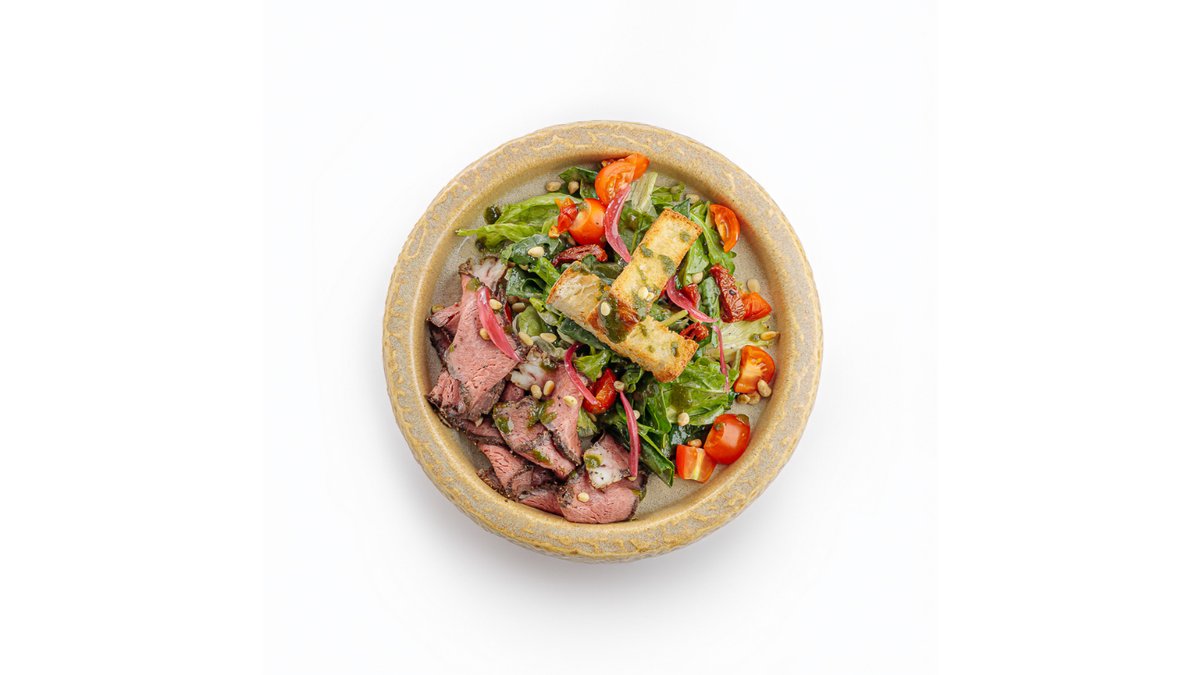 Ростбиф из мраморной говядины, микс салат, лук конфи, вяленые томаты, печеная паприка, домашняя чиабатта, песто, заправка равигот, кедровый орех