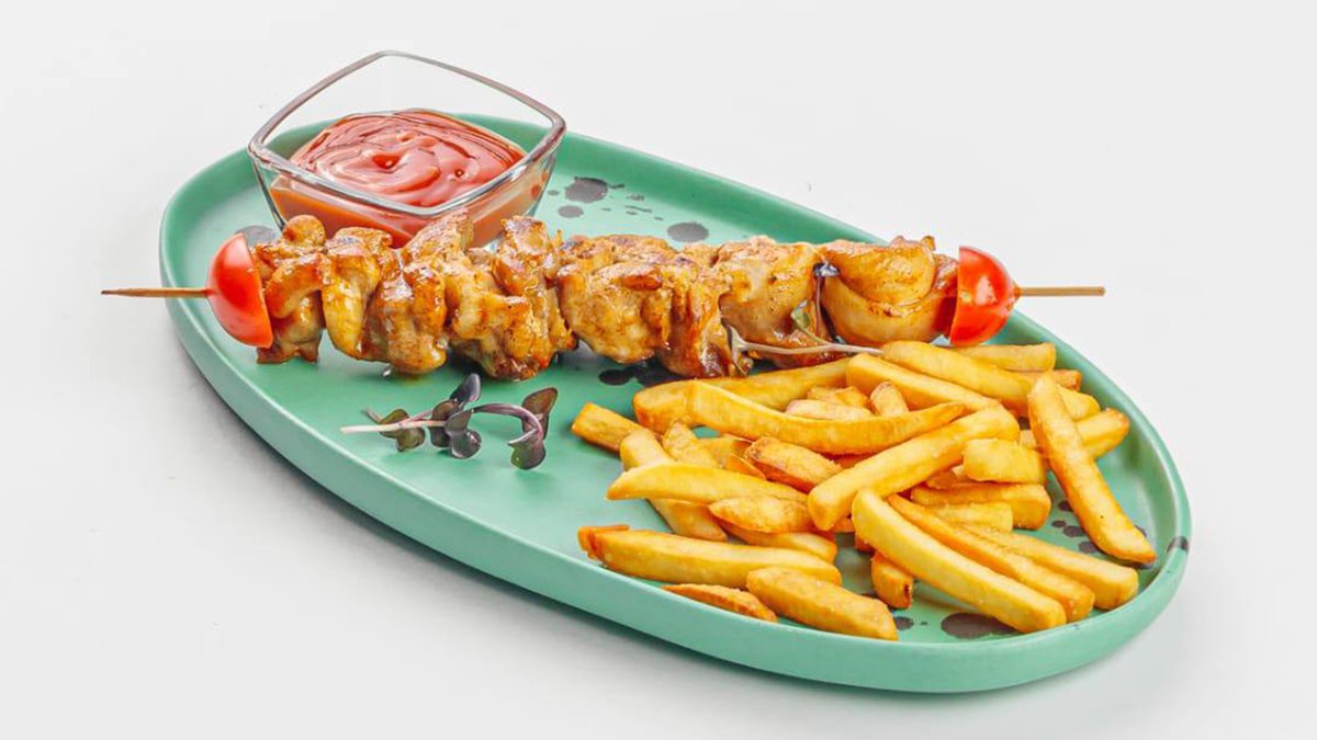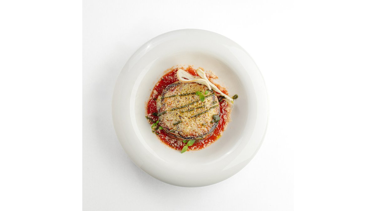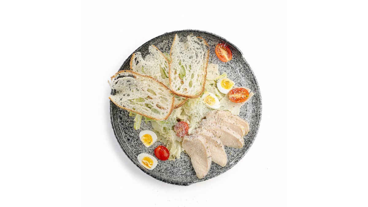 Куриная грудка, баклажан, микс салат, гарганзола, соус греческий, соус кремовый