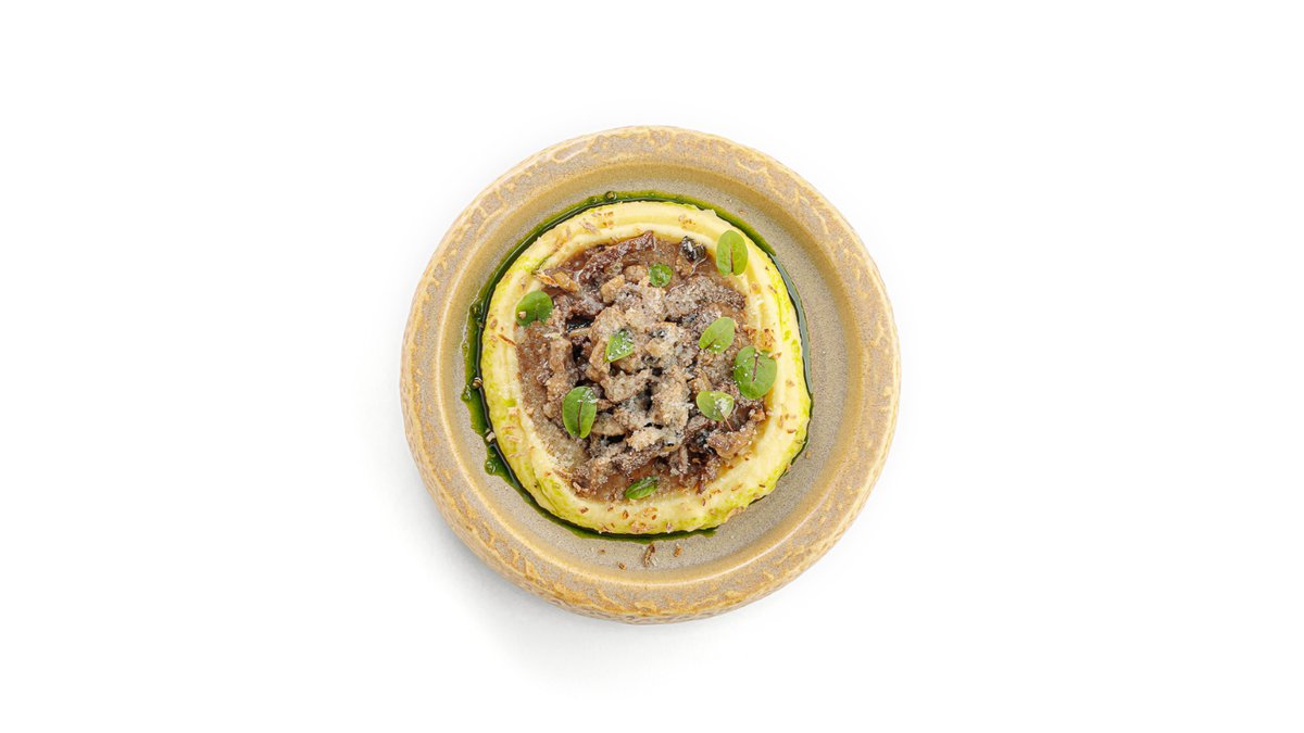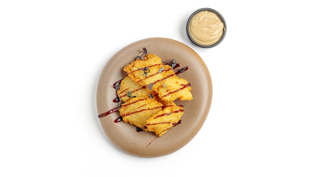 Драники, крем из молодого сыра, моцарелла, сыр с голубой плесенью