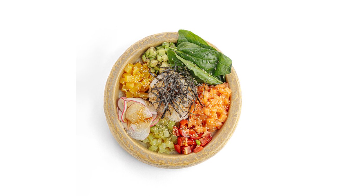 Лосось, японский рис, черри, лаймовый огурец, редис, манго, шпинат, авокадо, соус манго чили