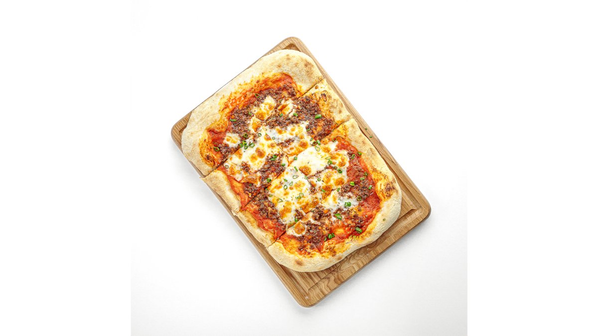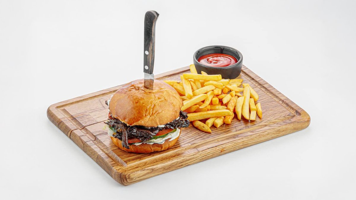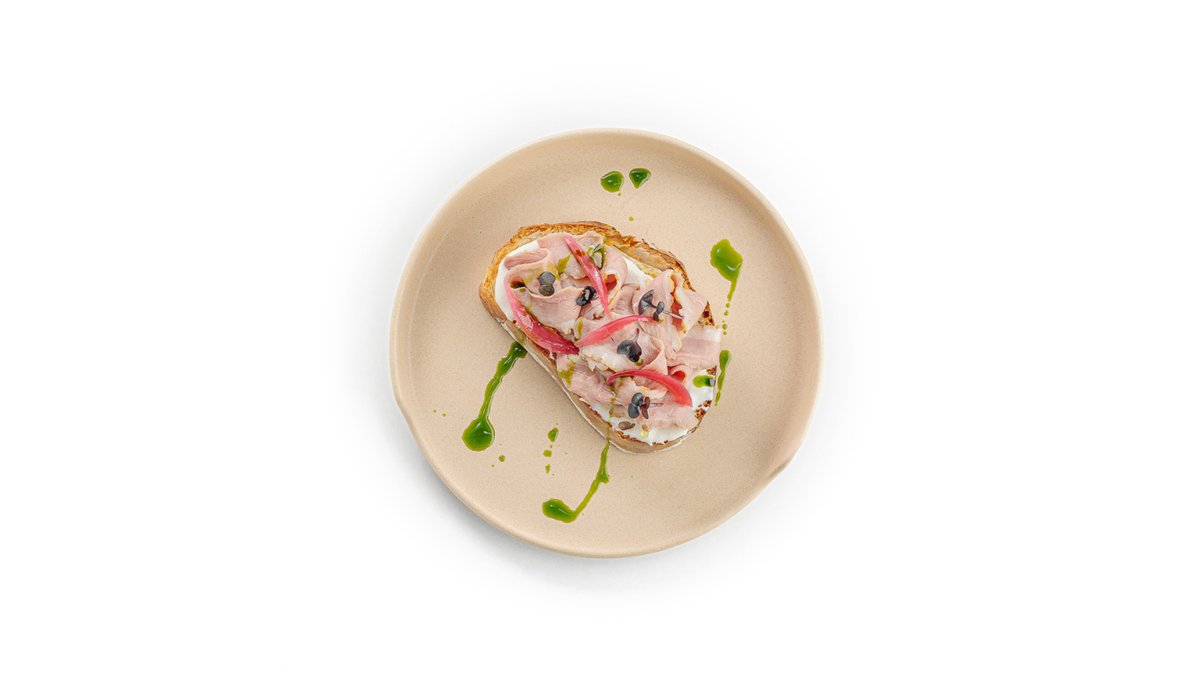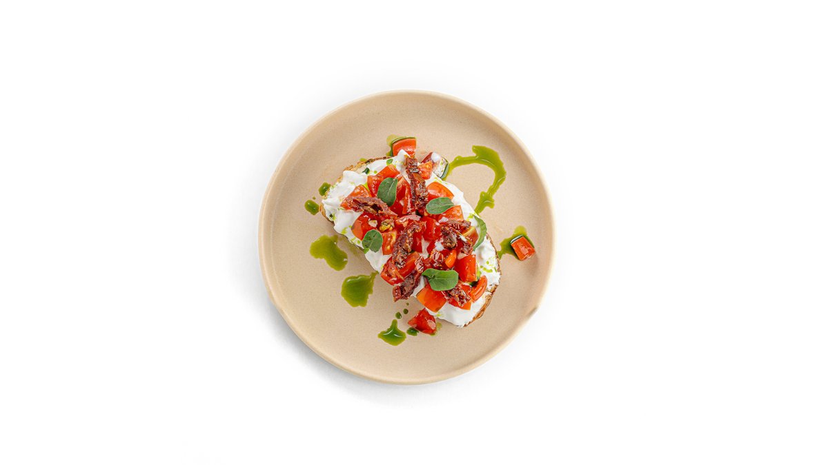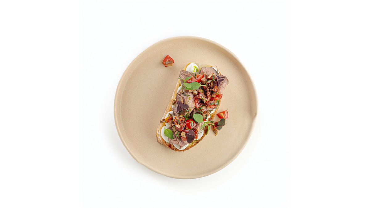 Домашняя чиабатта, крем из молодого сыра, запеченый перец, мраморная говядина пряна сальса 230г
