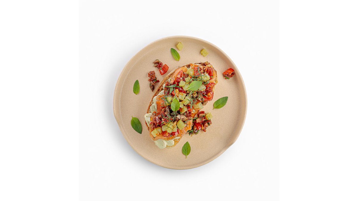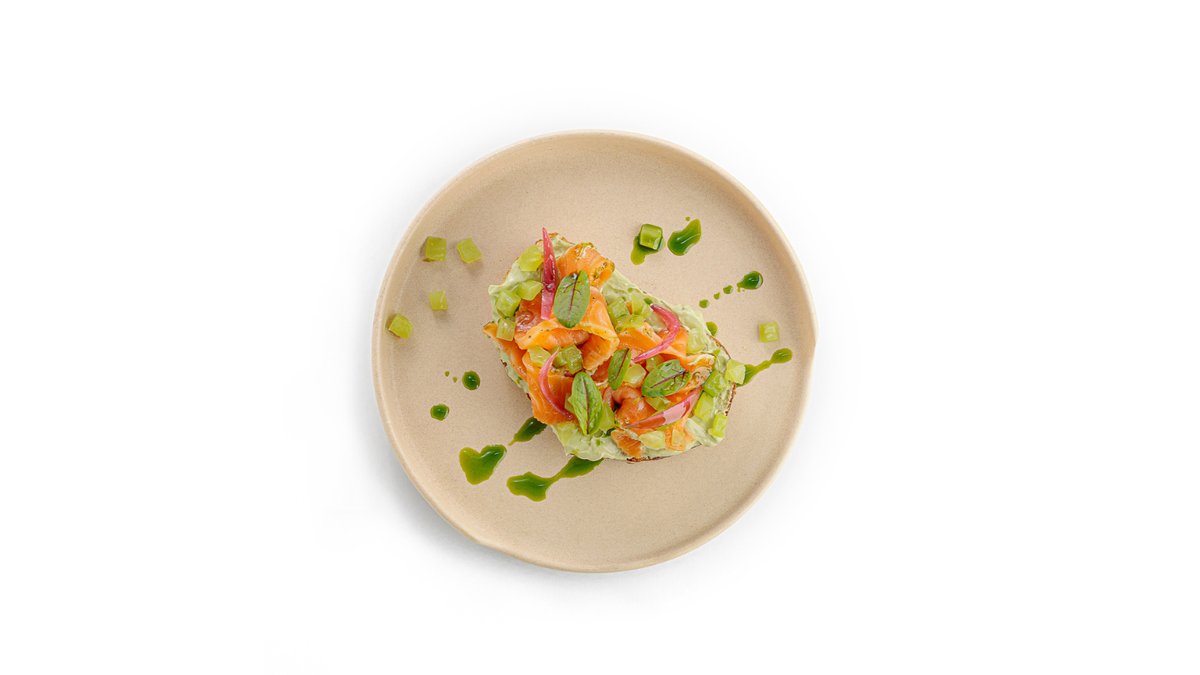 Домашняя чиабатта, крем авокадо, лосось слабой посолки, сальса, лаймовый огурец 195г