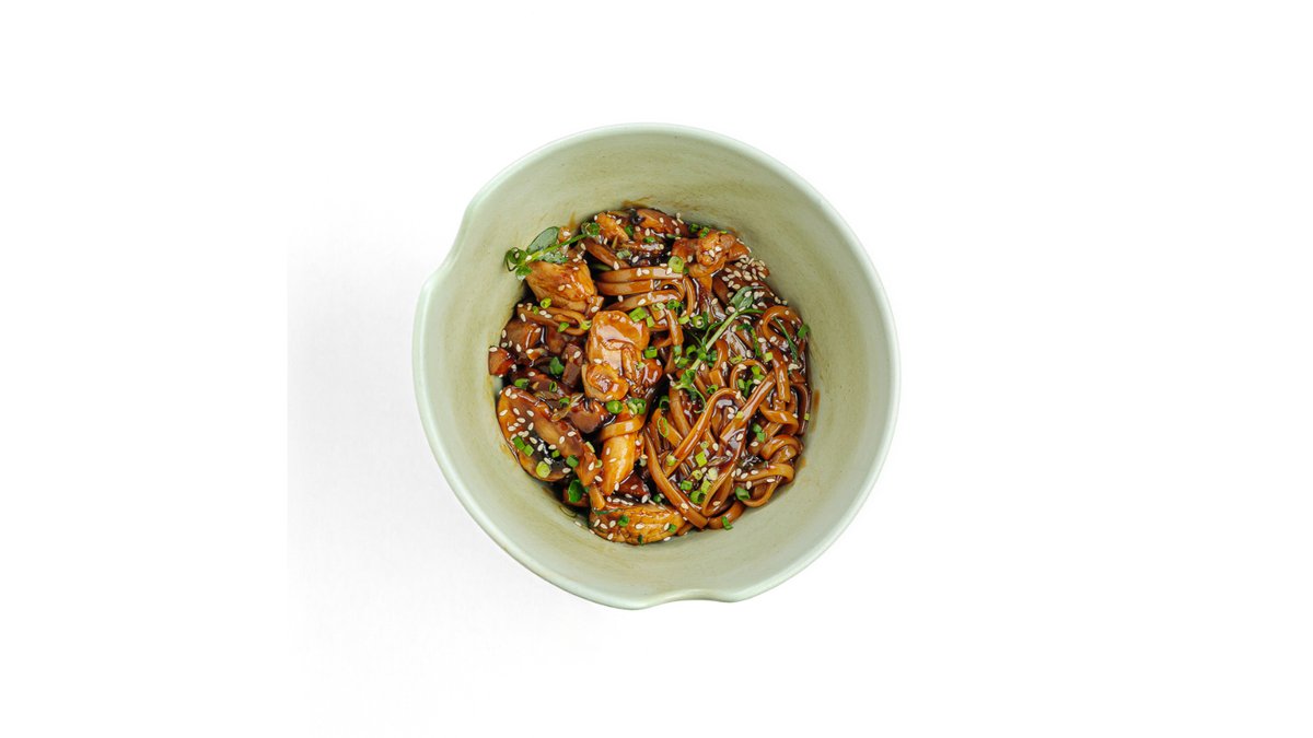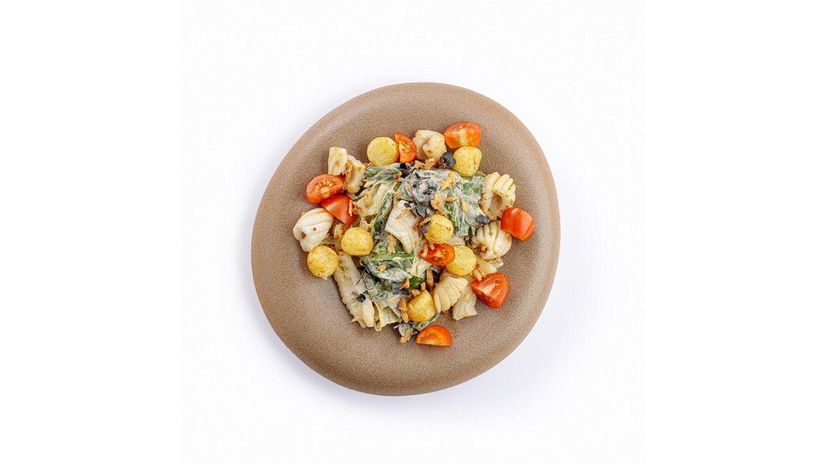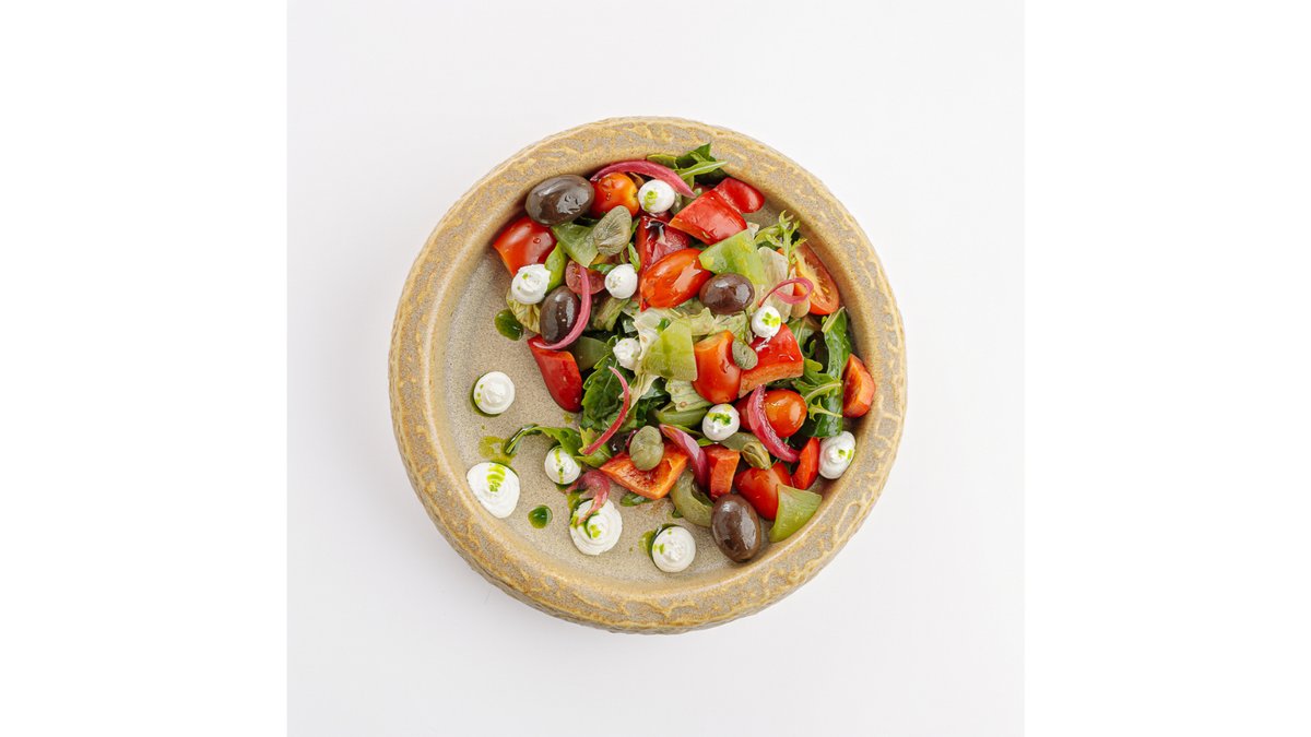 Баклажан, макс салат черри, красный лук, страчателла, соус свит чили, соус греческий, кунжут