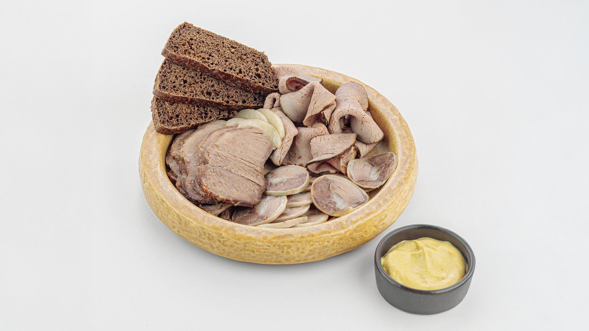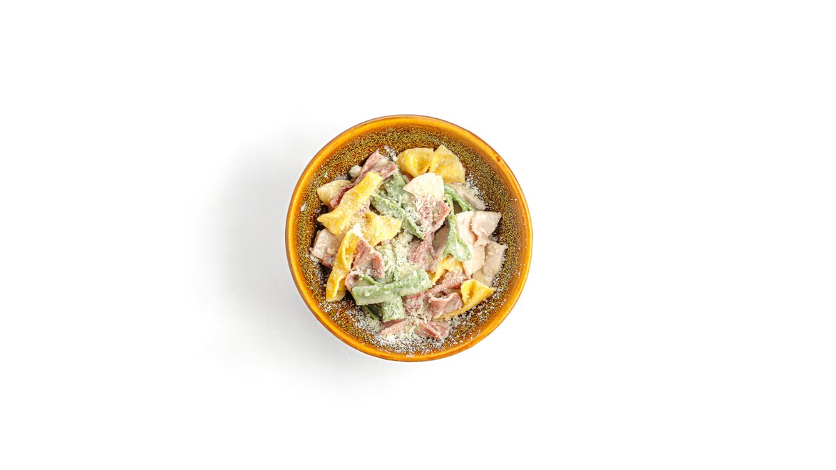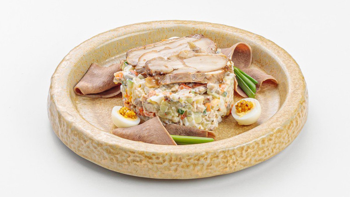 курица копченная, язык, яйцо перепелинное, картофель,морковь,огурец свежий,корнишон,майонез,зернистая горчица