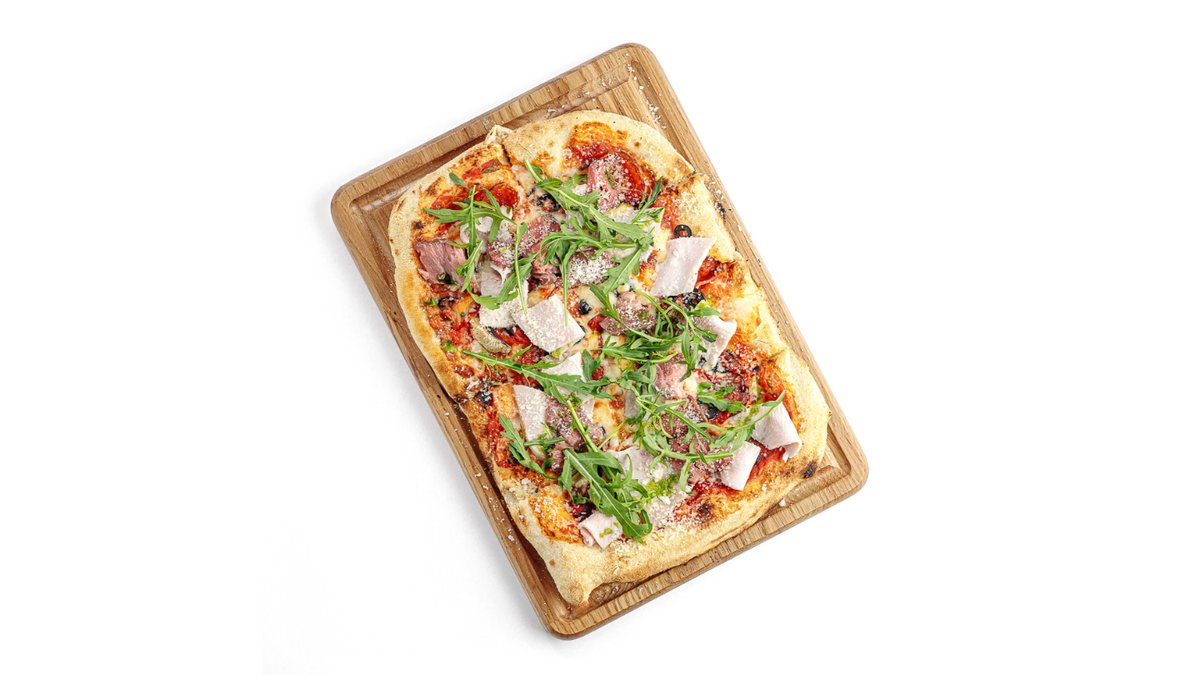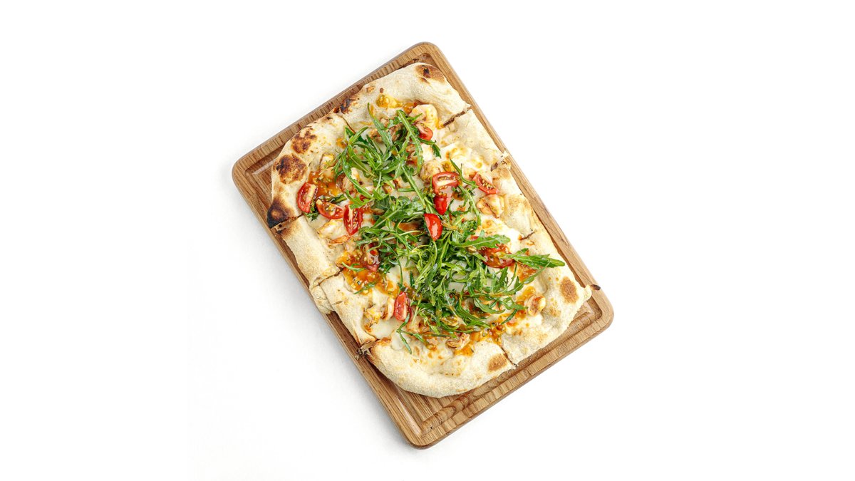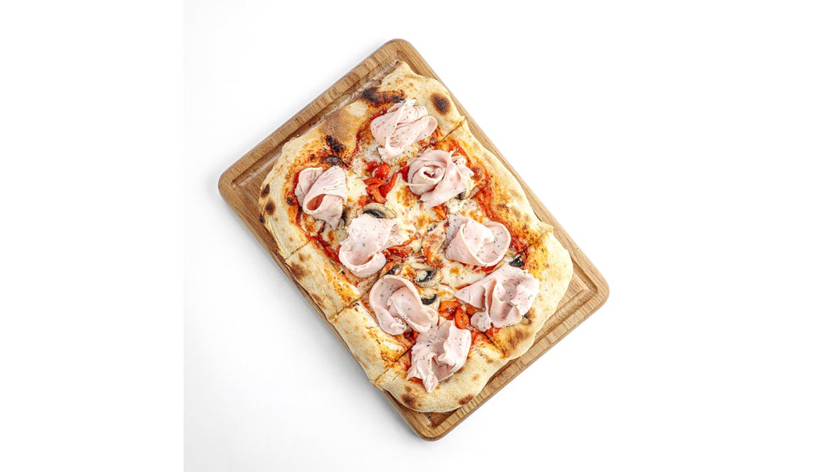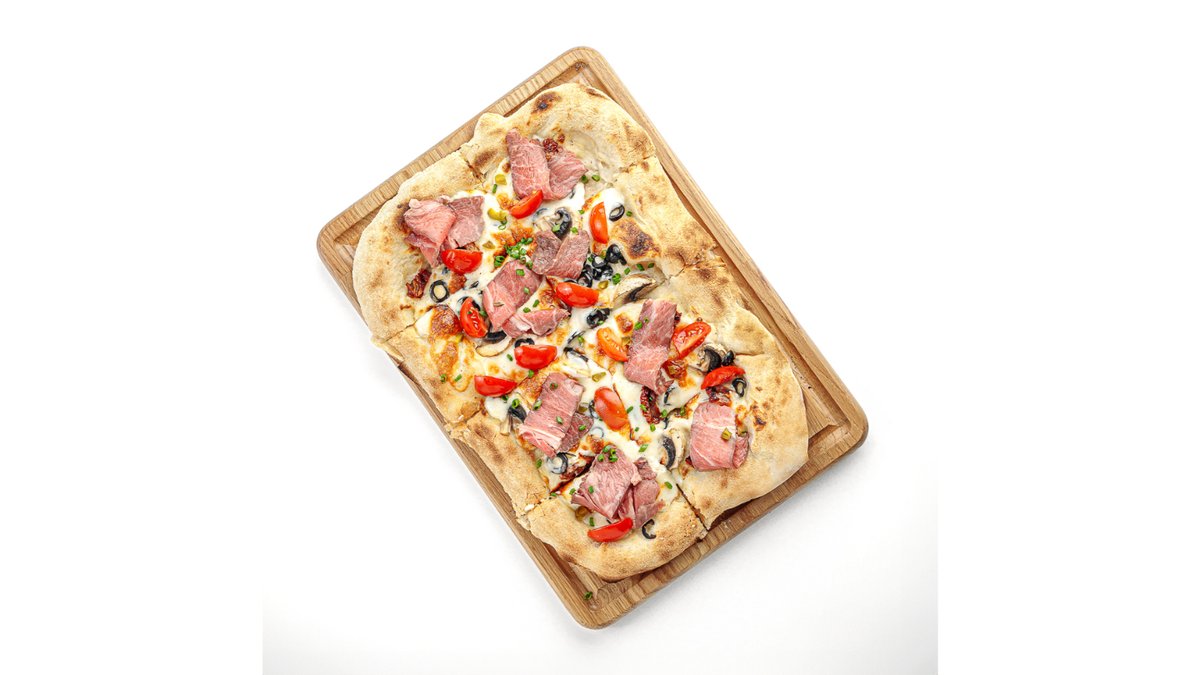 Копченый денвер стейк, копченая утка, куриная грудка, пеперони, домашняя чиабатта, крем пармезан, песто 390г