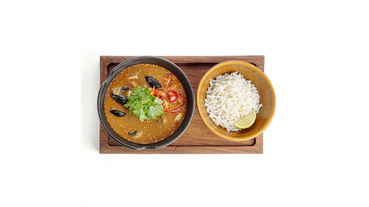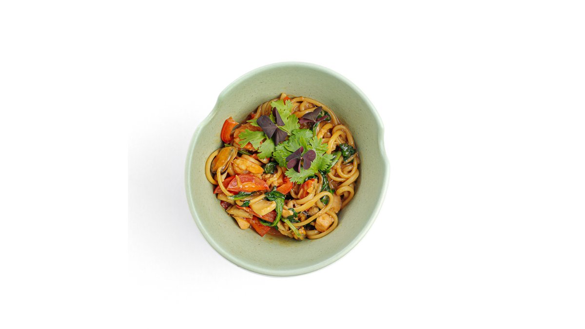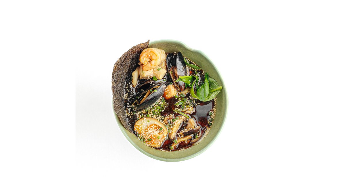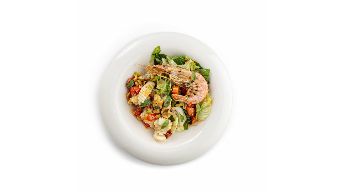 Кальмар, тигровые креветки, мидии, лангустин, черри микс салат, сальса, сельдерей, медолаймовая заправка