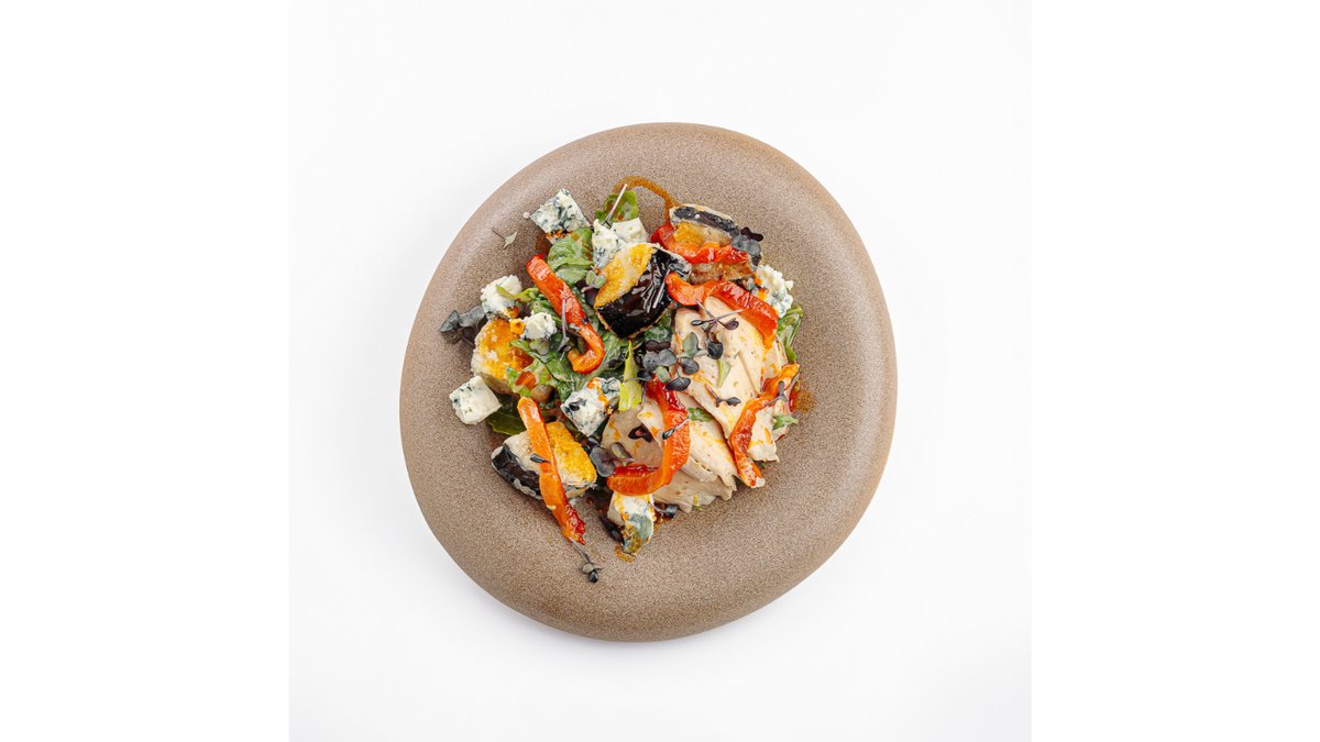 микс салата ,индейка ,вяленые томаты , медово-лаймовая заправка, карамелизированный грецкий орех,сыр бри