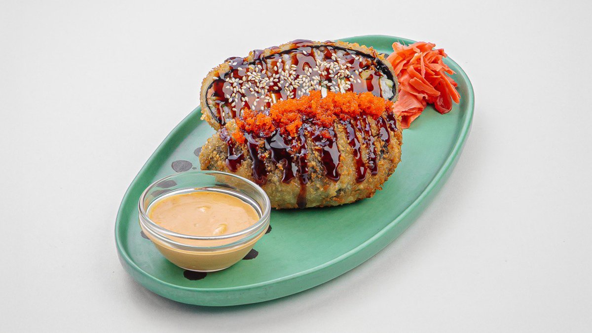 нори,рис,огурец,креветка панко ,сыр,соус унаги,масага