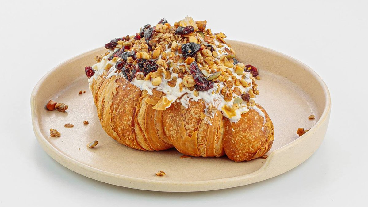 Скрембл из 3х яиц, поджаренный круассан, крем из молодого сыра, бекон или авокадо по вашему желанию)