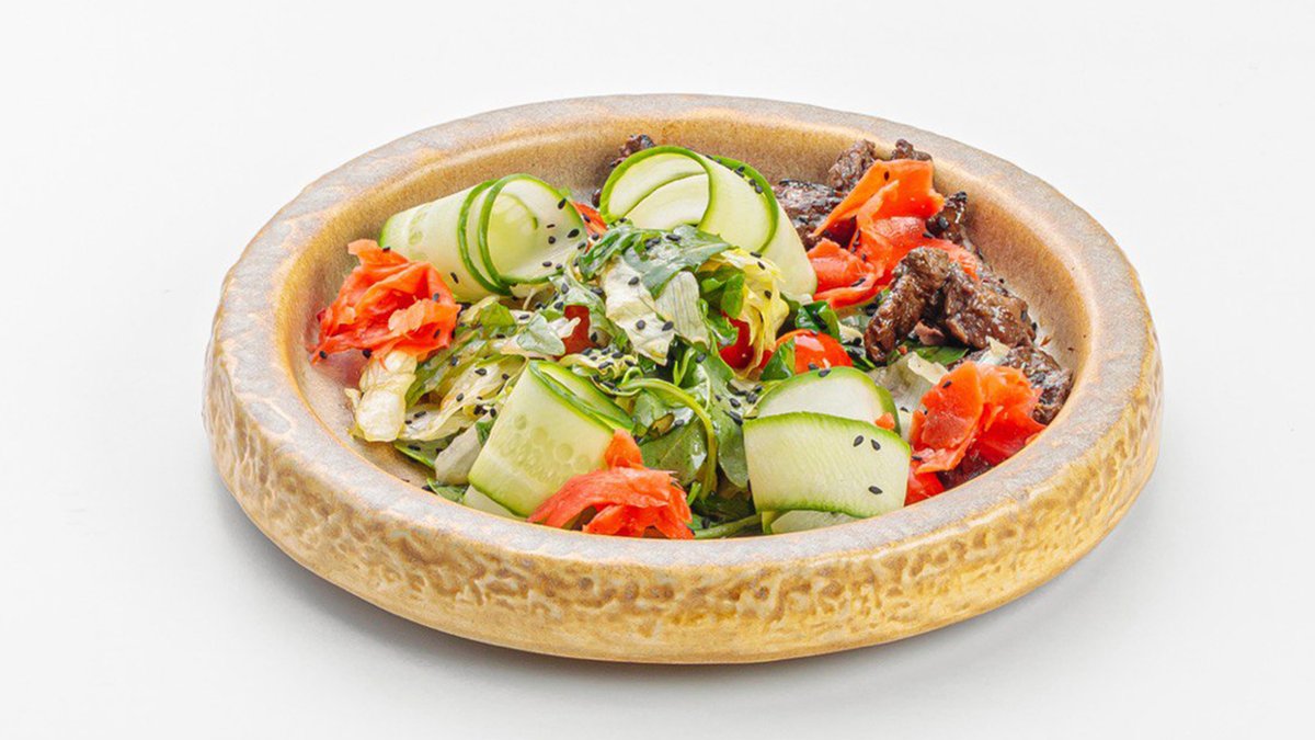 говядина.зеленый микс ,черри,огурец свежий,маринованный имбирь,заправка имбирная