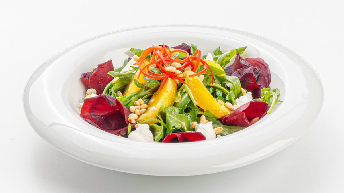 руккола, свекла,апельсин,крем фета,кедровые орехи,заправка цитрусовая ,перец болгарский для декора