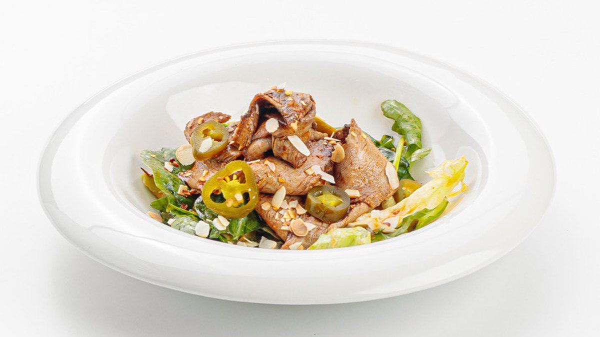 ростбиф, халапенью,микс зелени,авакадо,черри,лепестки миндаля,заправка острая