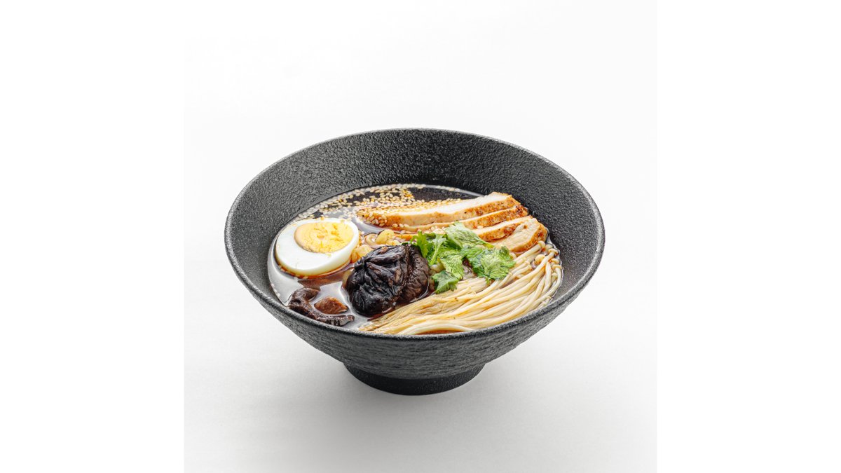 Лапша рамен, грибы шиитаке, говядина, кинза, кунжут, яйцо, грибы эноки.