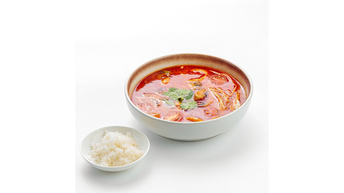 Том ям паста, лемонграсс, кокосовое молоко, рис, лайм лист, креветки, кальмары, мидии, помидор черри, шампиньоны, кинза.