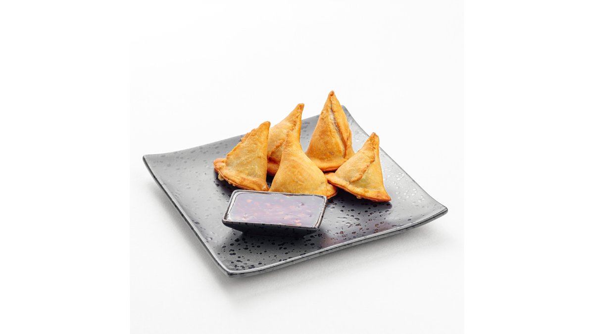 Тесто с зирой, картофельное пюре, масала, зеленый горошек, соус кисло-сладкий.