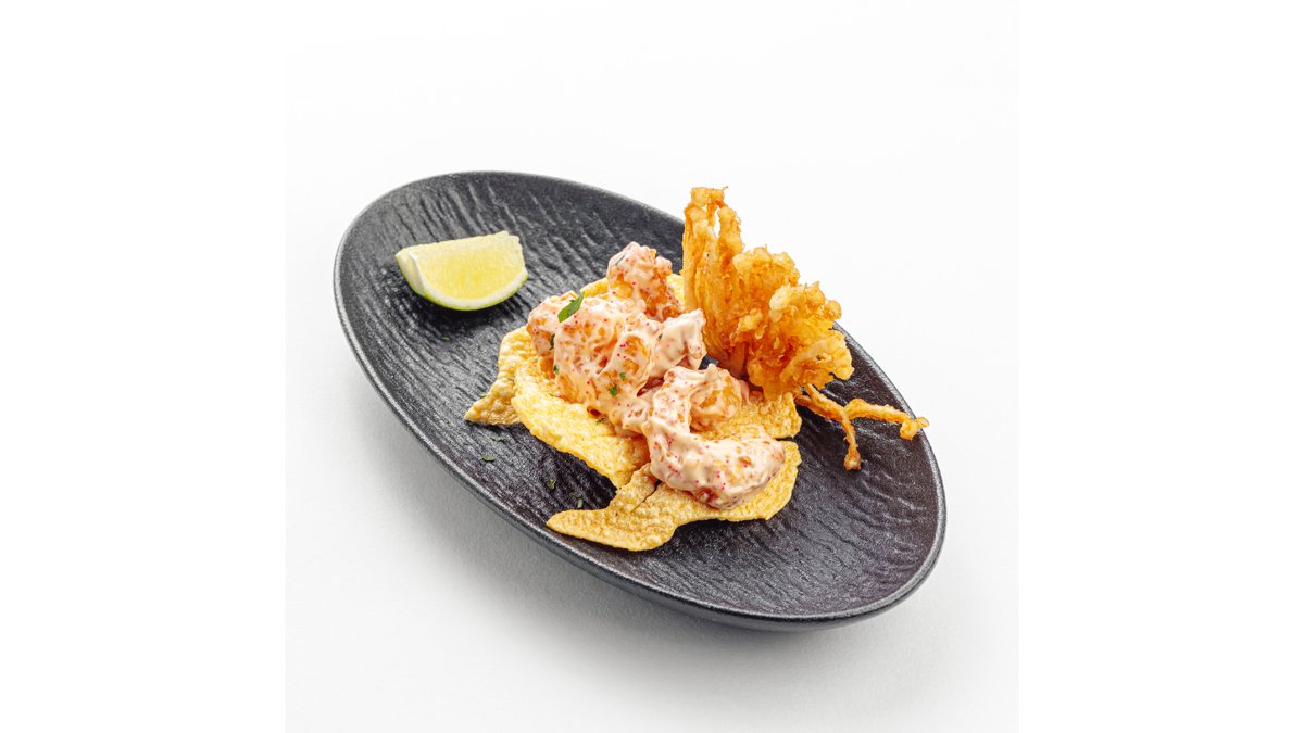 Креветки 16/20, кляр, соус маэр, лайм (соус маэр: майонез, кунжутное масло, мед), грибы эноки, чипсы из кукурузы.