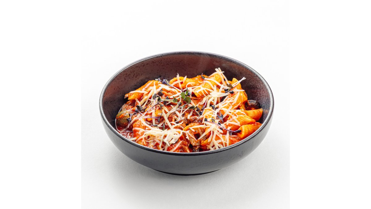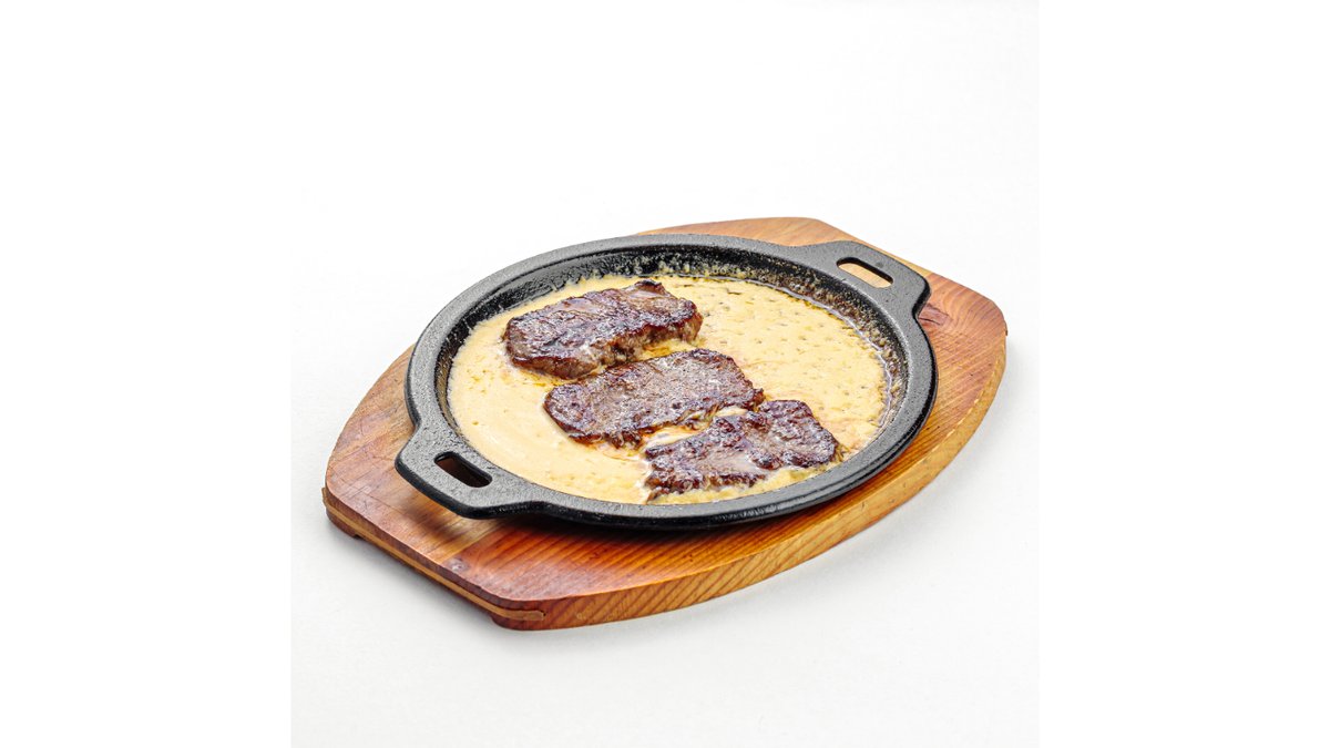 Баклажан, фарш говяжий, зеленый горошек, морковный фреш, сливки, сыр фондю, кешью.