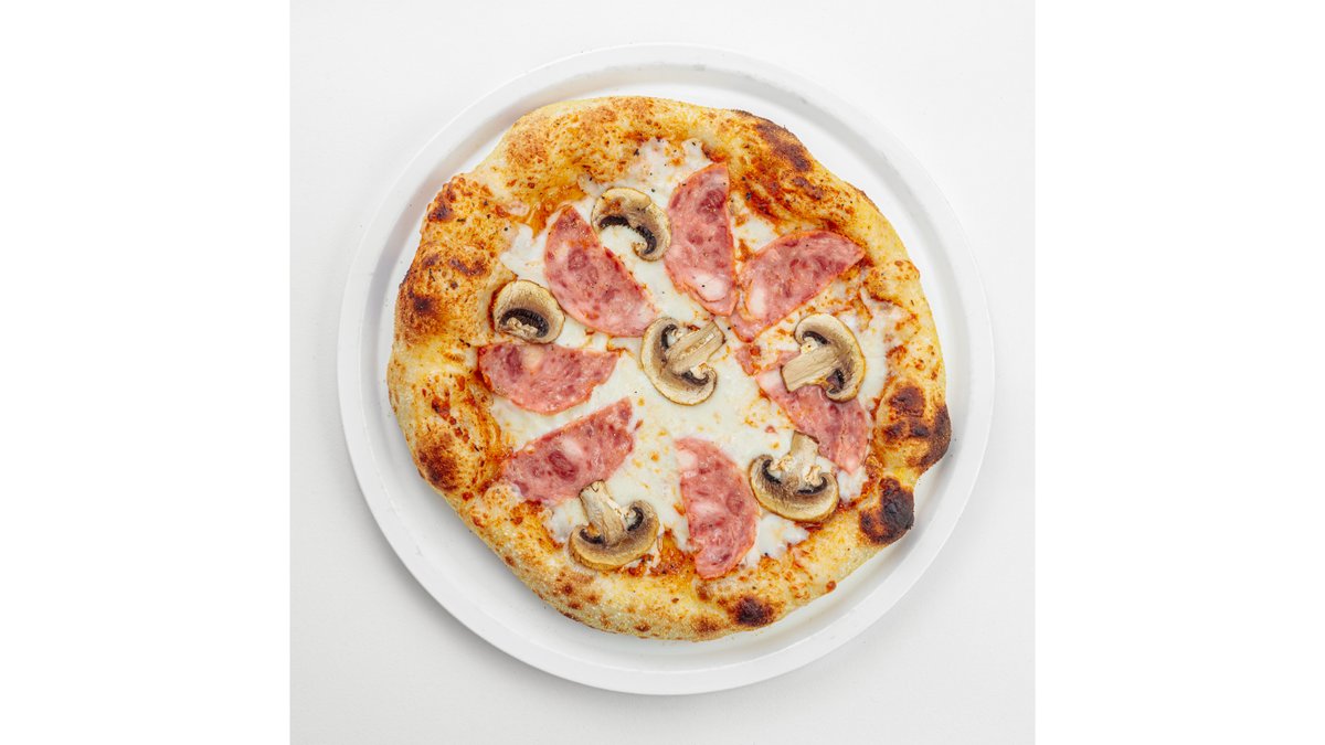Тесто для пиццы, грибы шампиньоны, ветчина, соус томатный, сыр моцарелла.