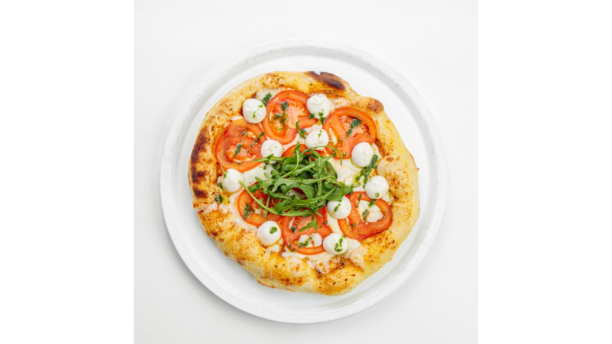 Тесто для пиццы, соус песто, петрушка, чеснок, пармезан, масло оливковое, кедровый орех, сыр моцарелла в рассоле, помидор, руккола.