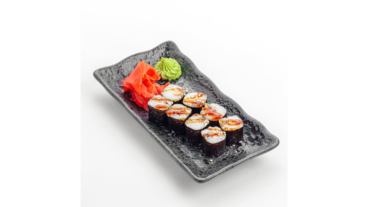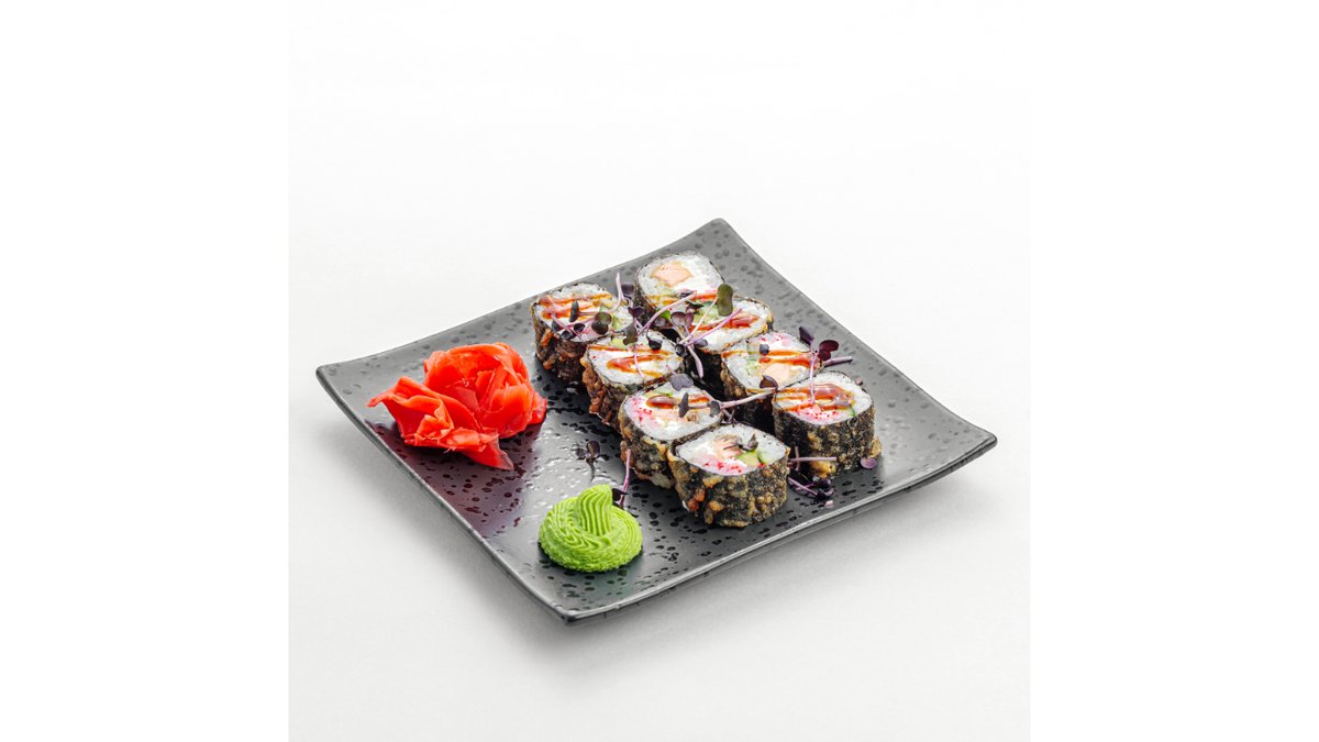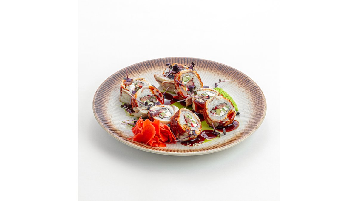 Рис, нори, васаби, крем чиз, авокадо, огурец, соевый соус, имбирь, соус унаги, креветка, кляр темпура.