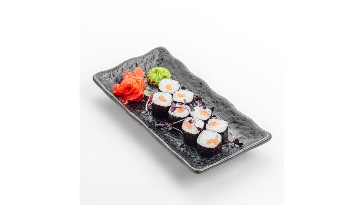 Рис, нори, лосось, имбирь, васаби, соевый соус.