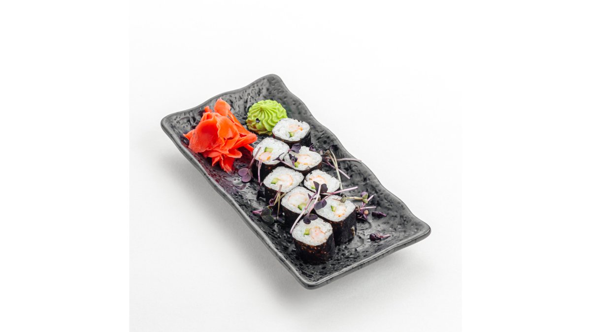 Рис, нори, креветка, соевый соус, васаби, имбирь.