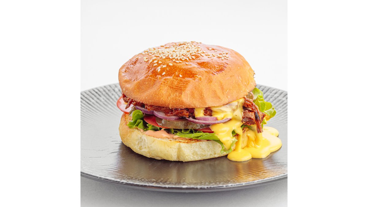 Томленая говядина, лук, помидор, огурец, лук красный, сыр чеддер фондю, лист салата.