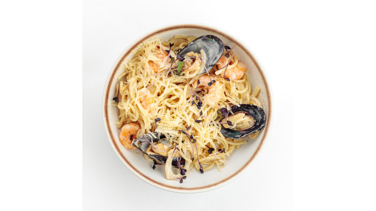 Спагетти, сливки, креветки, кальмар, мидии, пармезан.