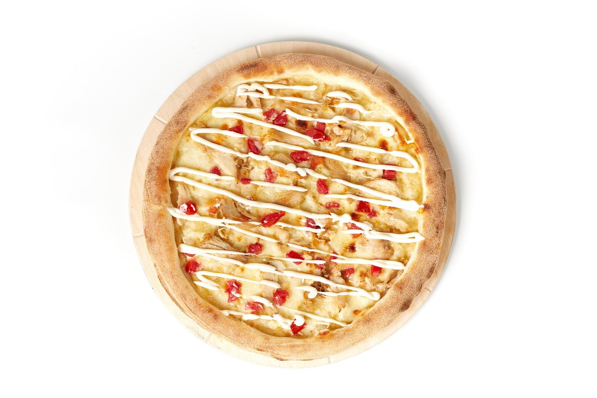 Классическое тесто для пиццы, Белый Соус, Сыр Моцарелла, Курица, Помидоры, Соус Цезарь