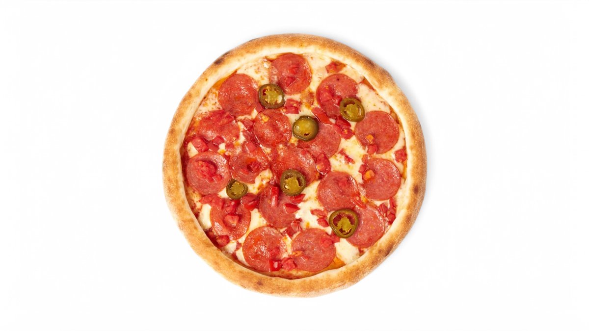 (Острая)Классическое тесто для пиццы, Фирменный Соус TheПАПА, Сыр Моцарелла, колбаса Пепперони, Помидоры, Перец халапеньо