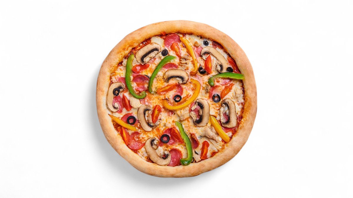 Соус для пиццы, сыр моцарелла, колбаса чоризо, курица, перец светофор, свежие шампиньоны, помидоры