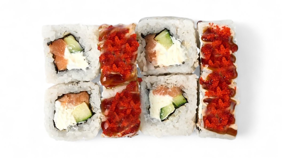 (Слабо-острый)Рис, Нори, Острый Сыр, Огурцы, Угорь, Такуан, Лосось, Кляр