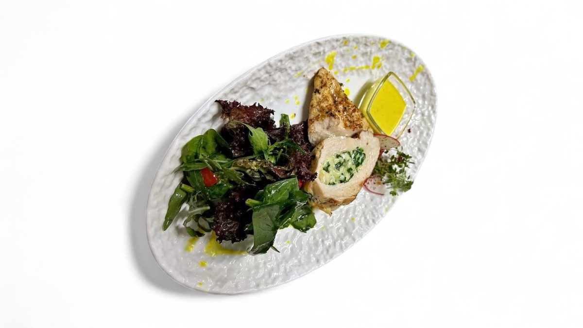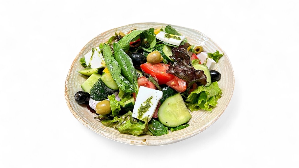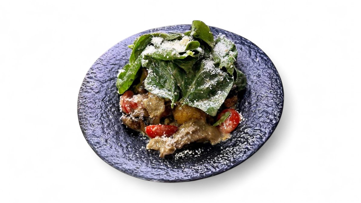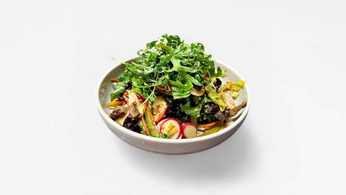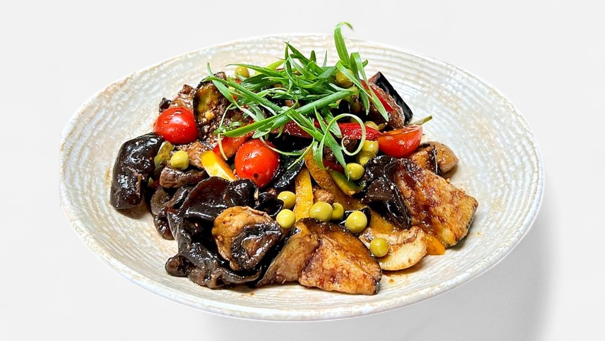 баклажаны в панировке с миксом зелени и кисло-сладкой заправкой