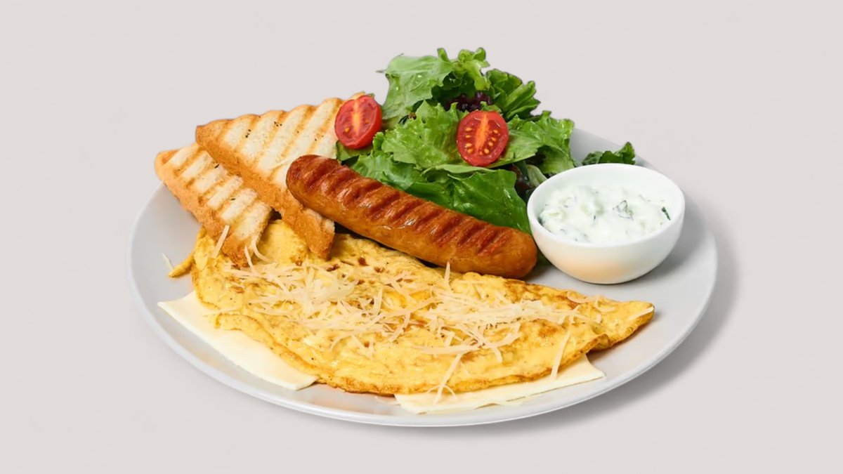 Омлет с ветчиной, плавленный сыр, сыр "Пармезан", хлеб тартин, зеленый лук