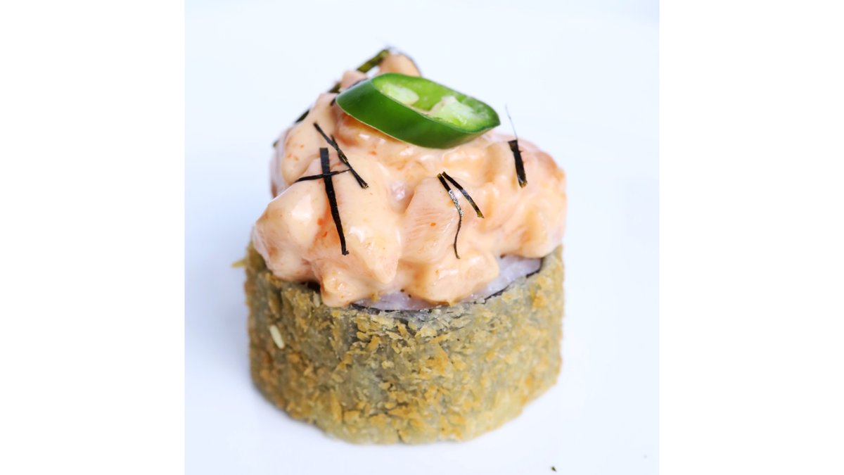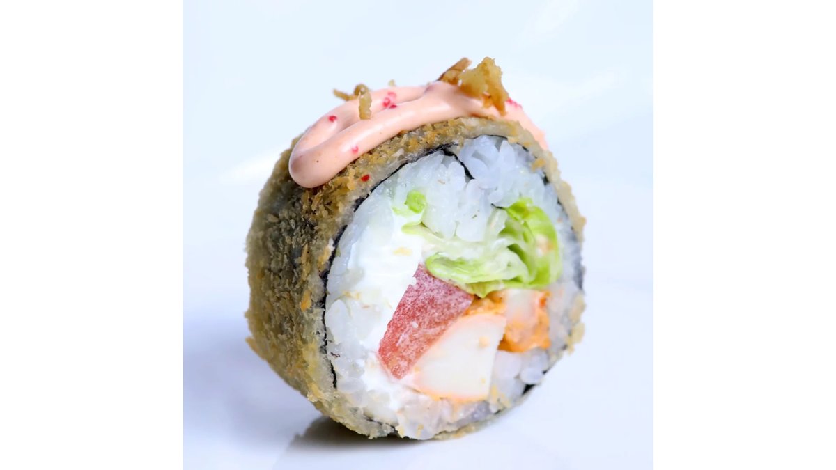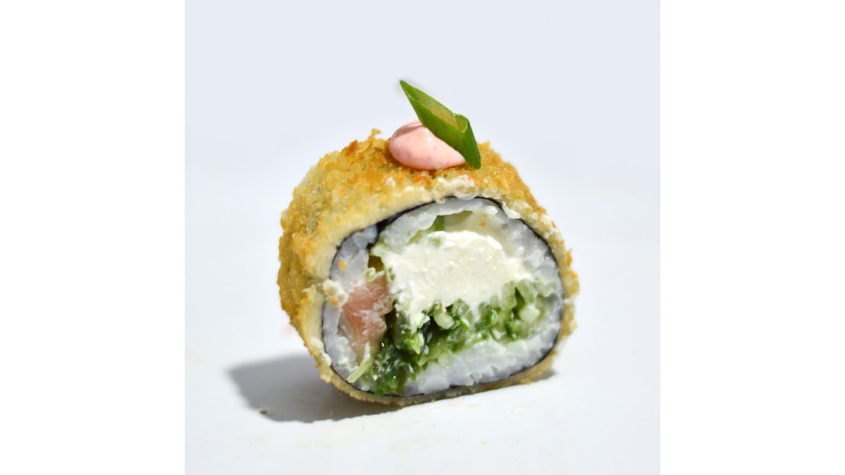 Рис, нори, сыр творожный, креветка темпура, огурец, авокадо, лосось, ширачи соус, зеленый лук