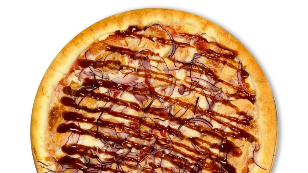 Пицца соус, сыр моцарелла, красный лук, барбекю соус, куриное филе