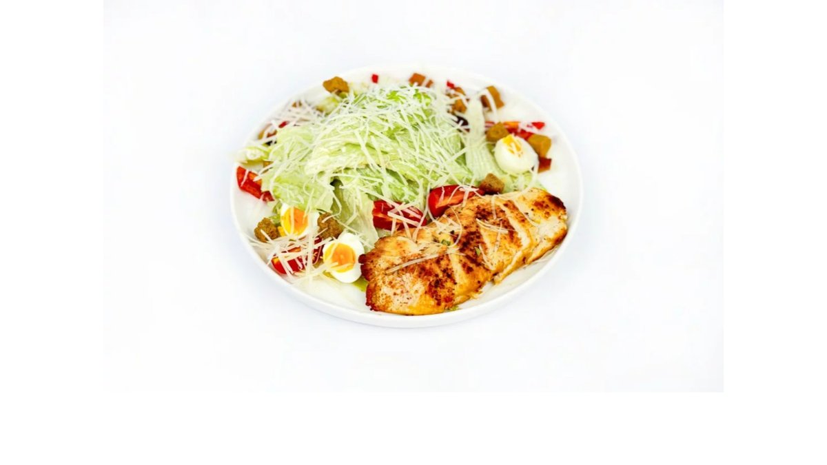 Айсберг, яйца перепилинные, томаты черри, сухари, куриное филе, цезарь соус, сыр пармезан