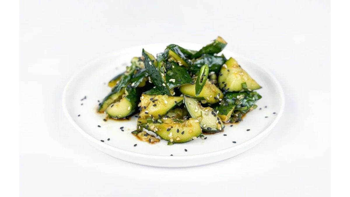 Огурцы, стручковый перец, кинза, соус, кунжут