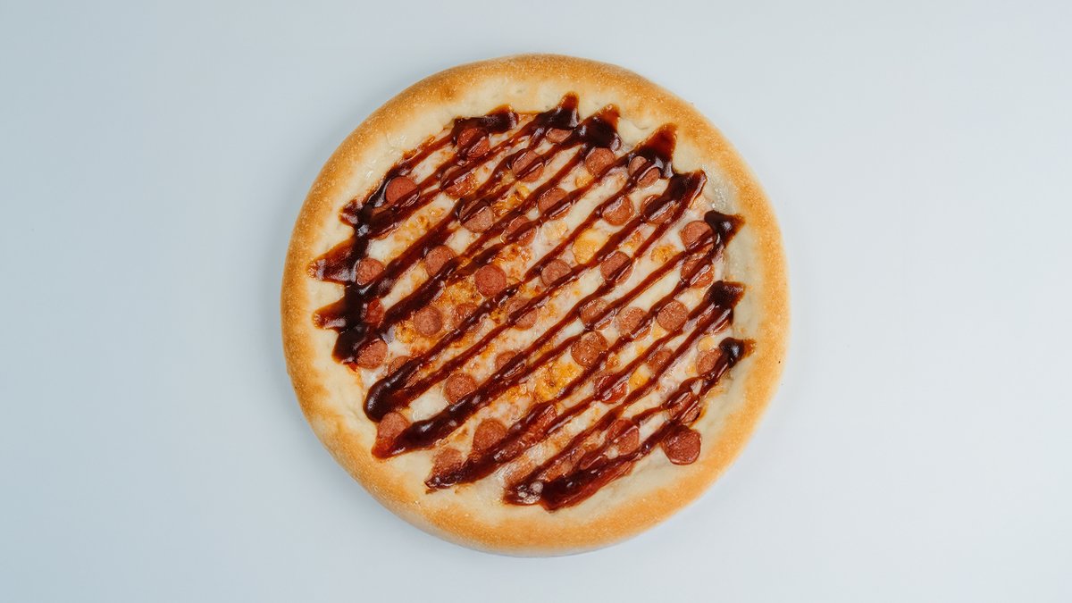 Пицца соус, сыр моцарелла, копченные колбаски, барбекю соус, перец болгарский
