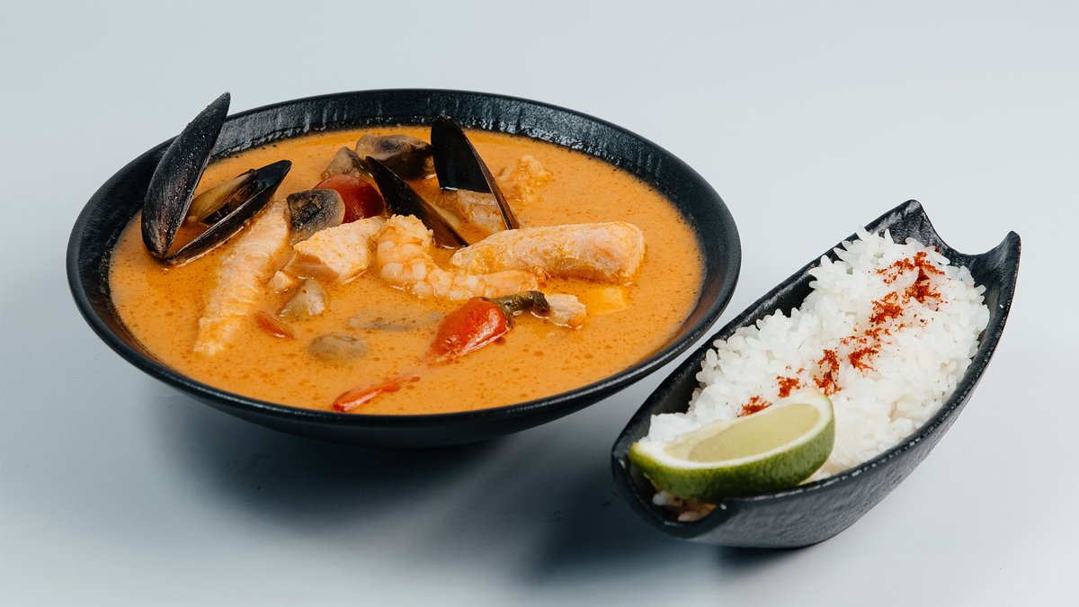Рис, паста том ям, креветки, лосось, мидии, грибы шампиньоны, томаты черри, лайм