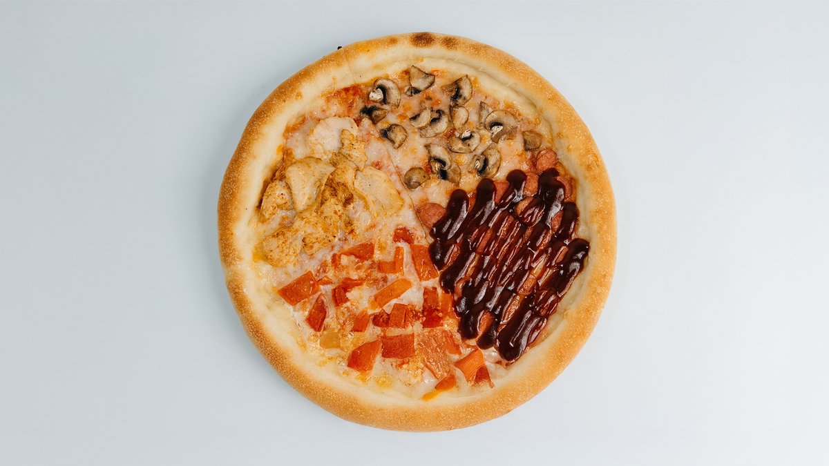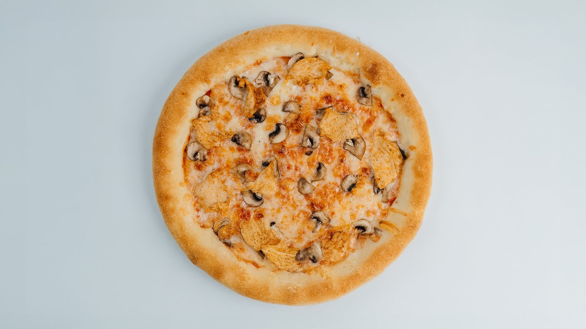 Пицца соус, сыр моцарелла, колбаса (халал), томаты, грибы шампиньоны, куриное филе