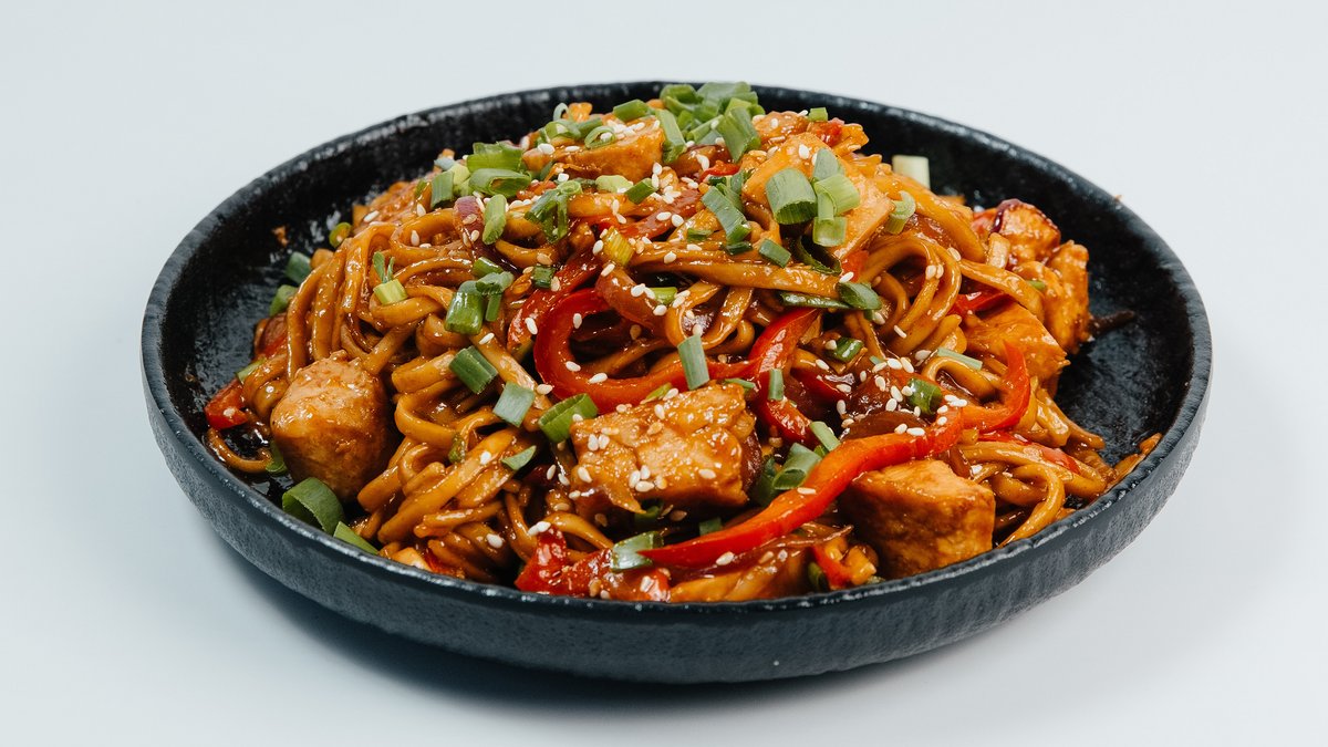 Фирменный соус, лапша удон, лук репчатый, лук зеленый, болгарский перец, куриное филе