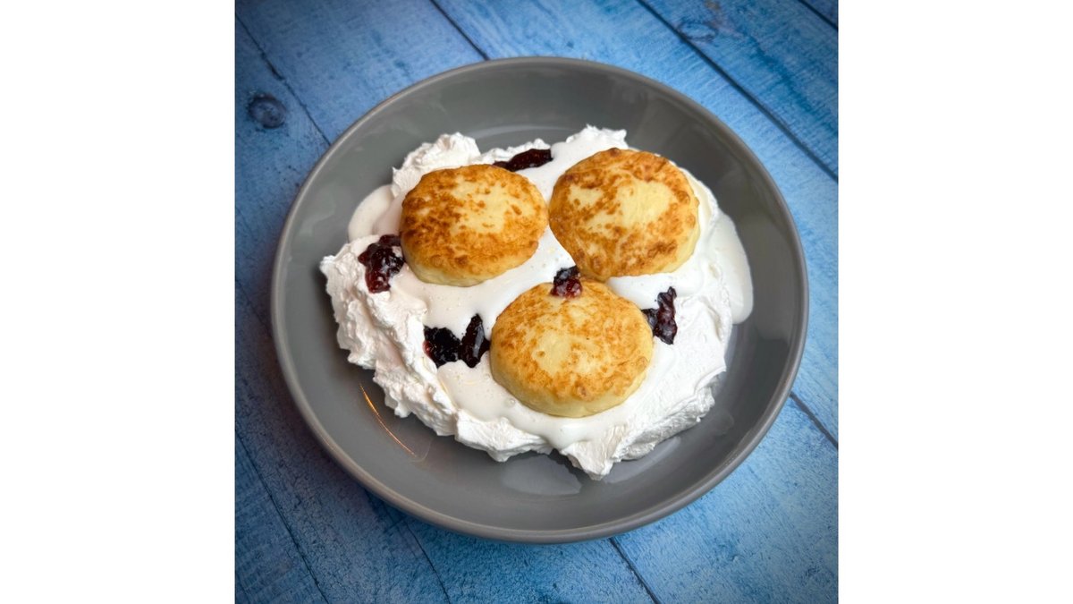 Syrniki (Cheese Pancakes) with Condensed Milk Mousse