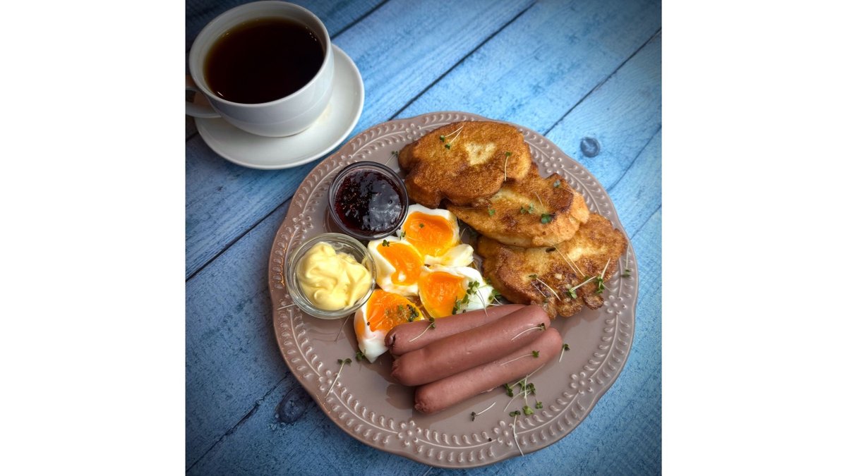 Egg, baguette, boiled sausage. 290 g + 40 g (jam and butter)