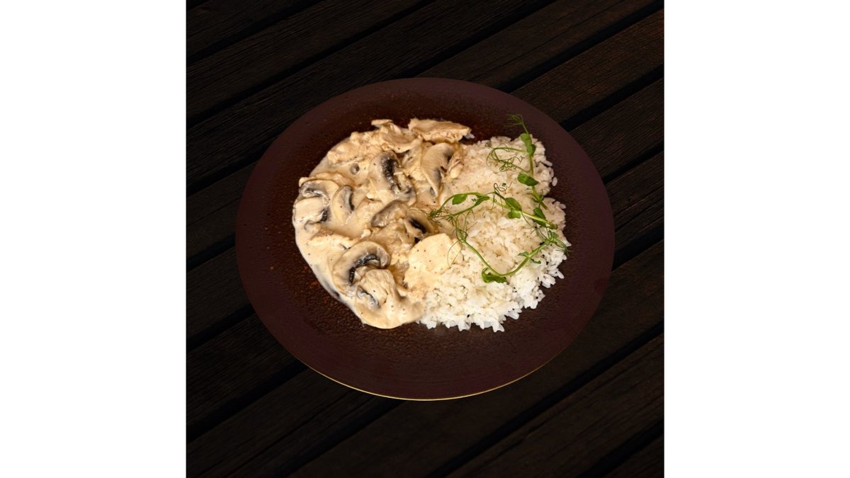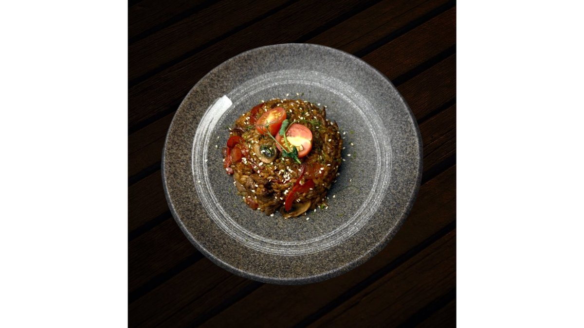 Beef, rice, mushrooms, champignons, onions, bell peppers, tomatoes, soybeans, sesame seeds, cherry tomatoes.