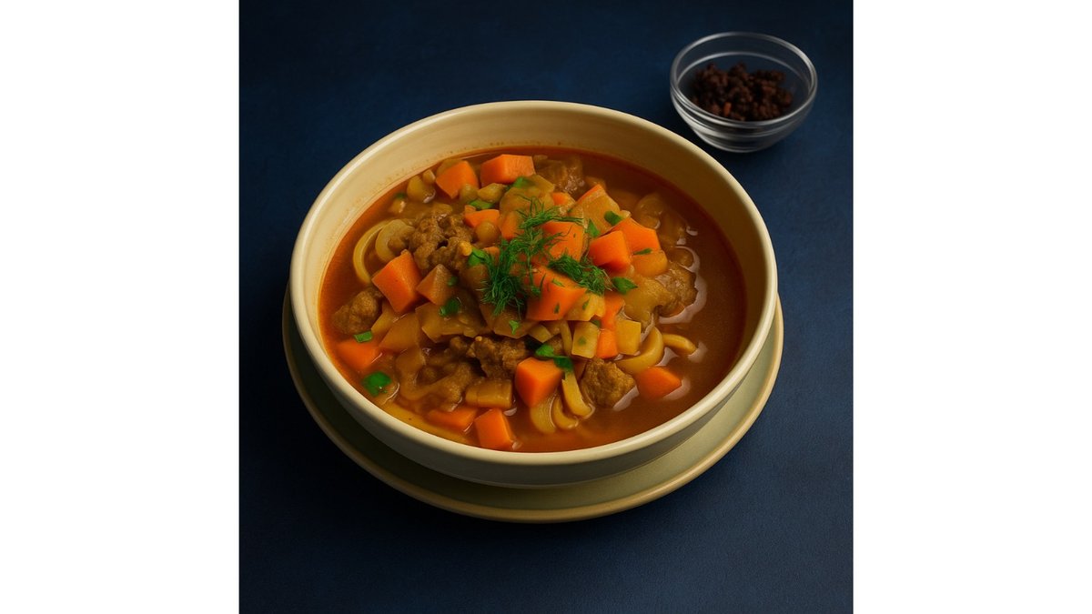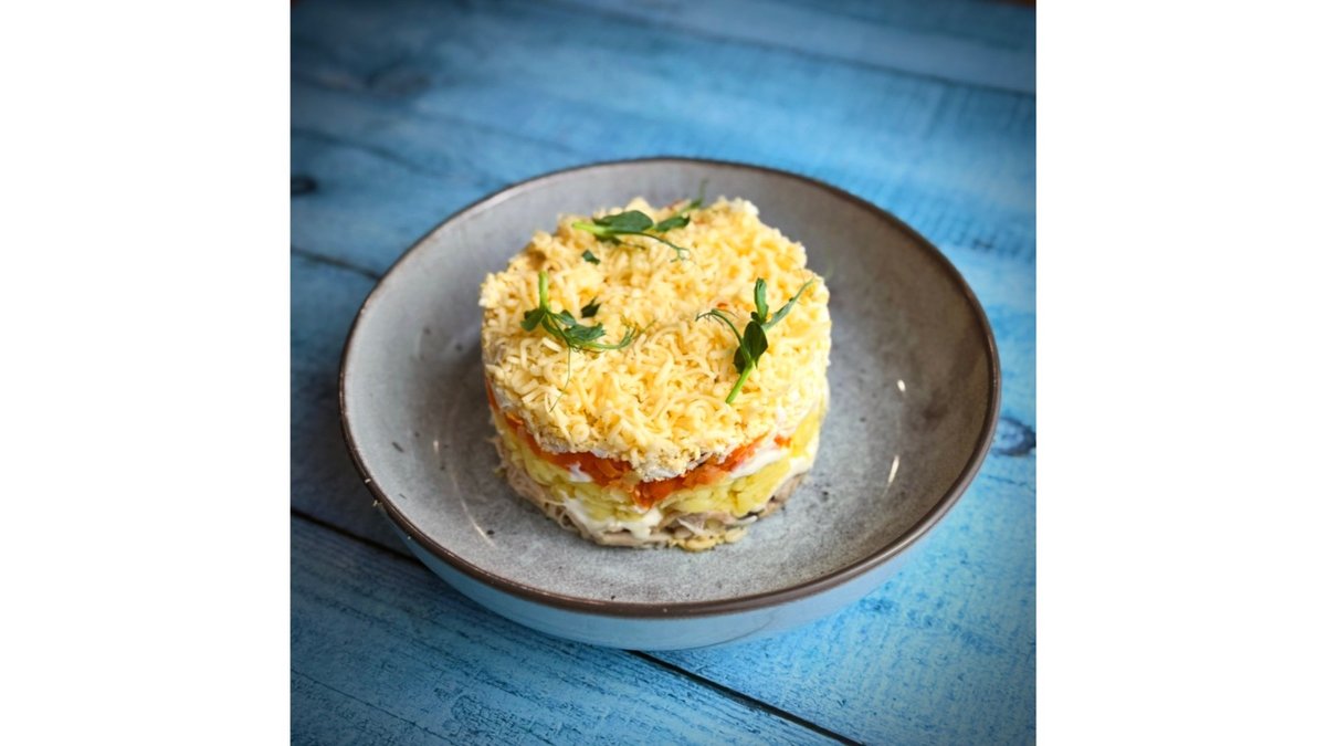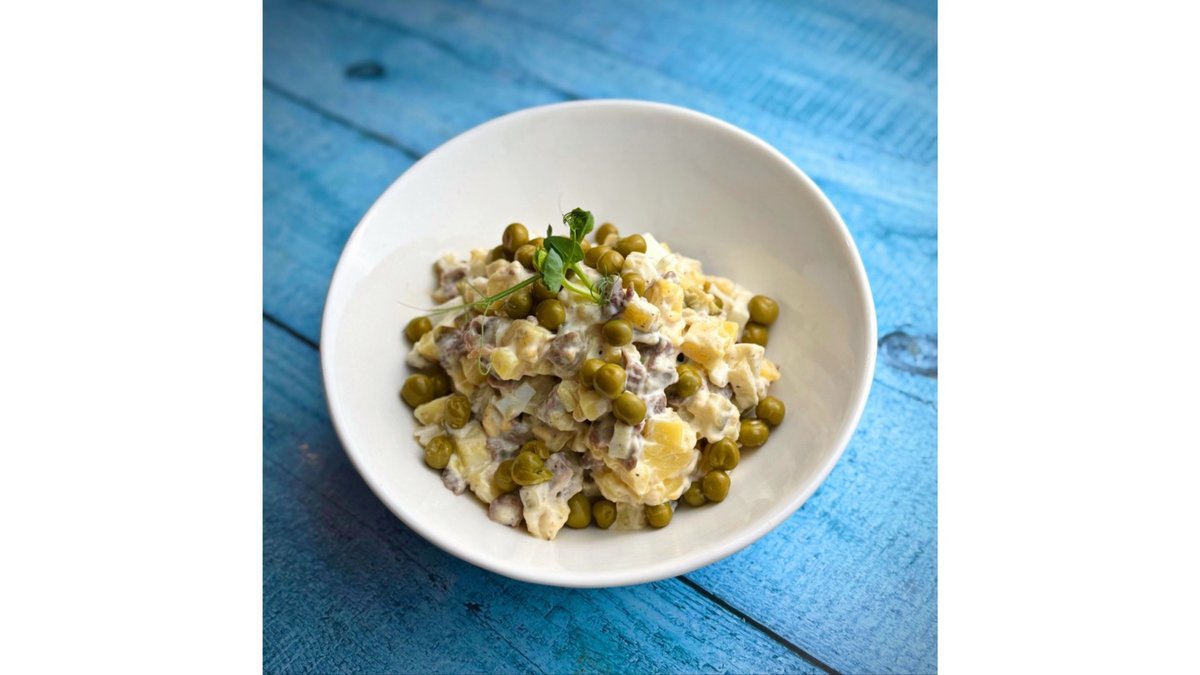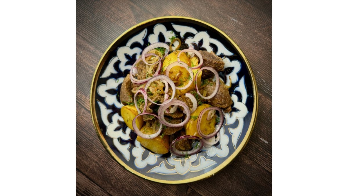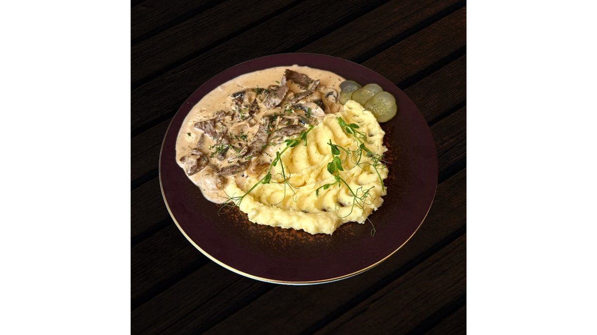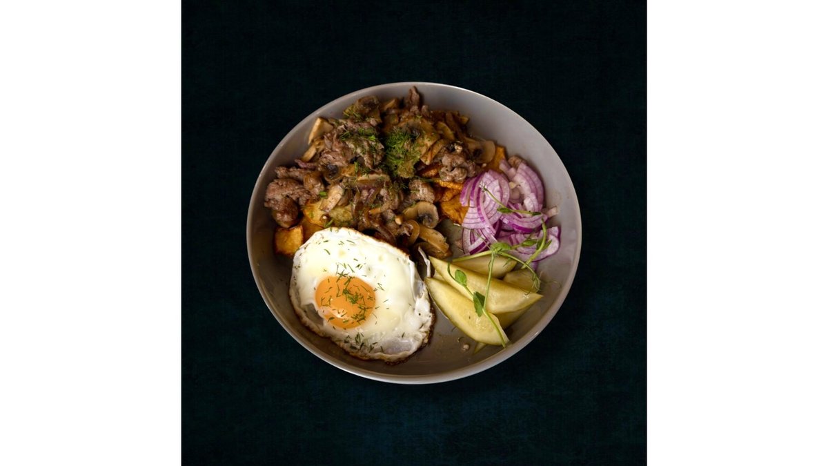 Beef, onions, mushrooms, potatoes, eggs, pickles, dill.